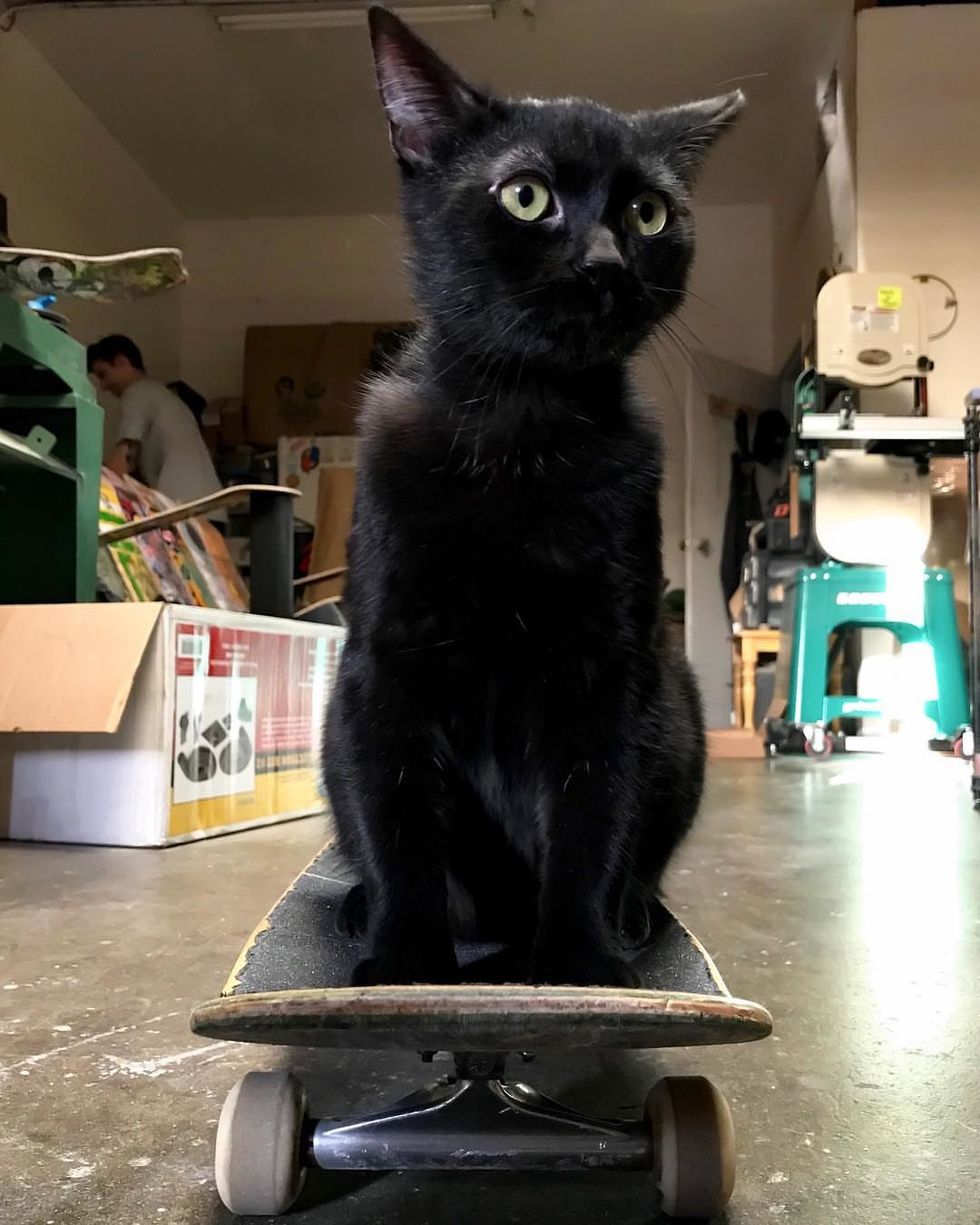 Grizzly is the perfect supervisor. One of his duties is to inspect the skateboard decks by napping on them.