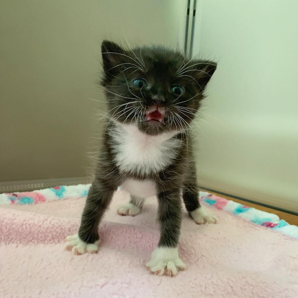 The kitten was in rough shape and couldn't open his eyes as they were crusted shut. "They asked if we could help this 'sick kitten that was found,' how could we refuse? We rallied around him and gave him every ounce of critical care we could," Sarah Kelly, founder of the rescue, shared.
