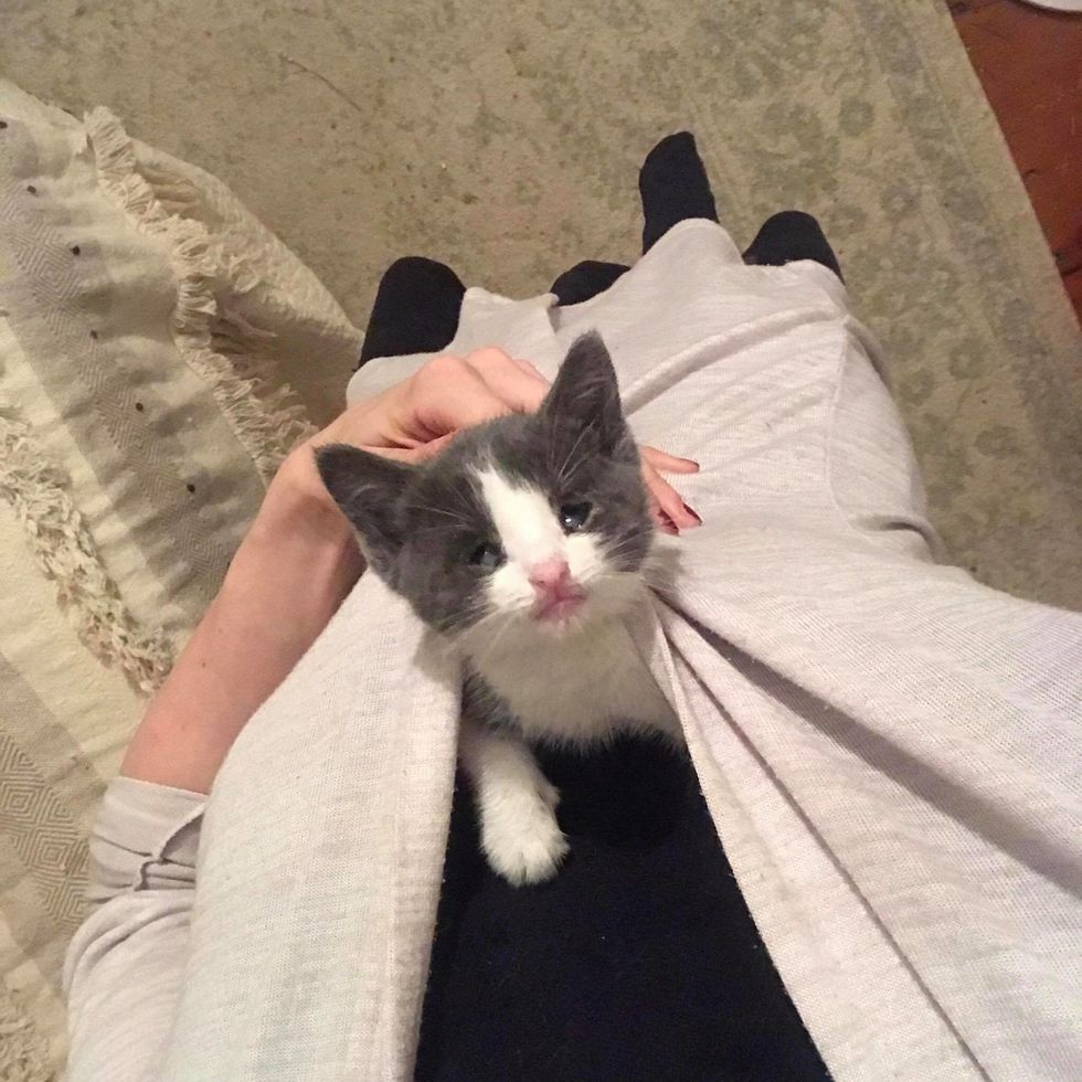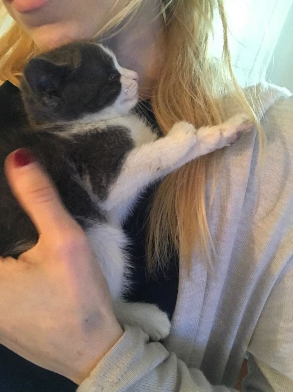The tiny kitten has quite the cattitude. She will meow incessantly until she's cuddled and loved.