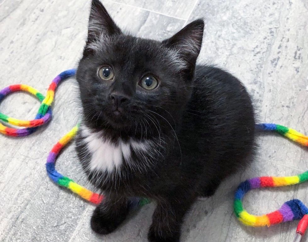 She has blossomed into a gorgeous tuxedo cat with the cutest little collar, ear tufts and one pink toe bean.