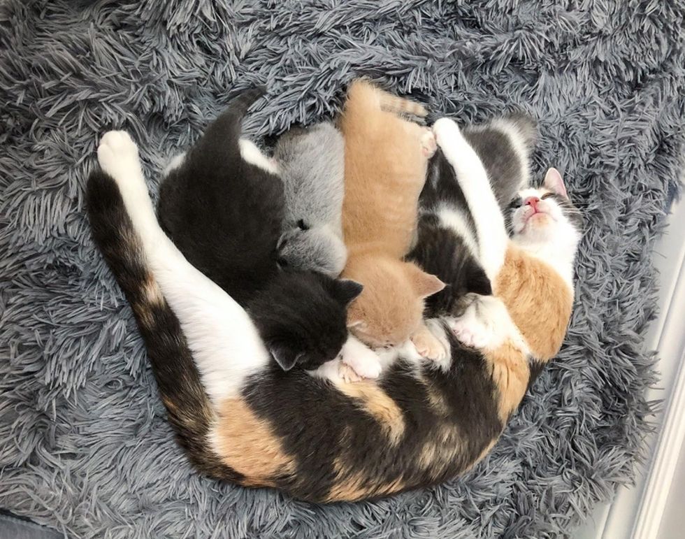 Her own litter of kittens quickly took to the newcomer and started snuggling with her in a purr-filled cuddle puddle. Jasmine instantly connected with the new sister and took her right under her wing.