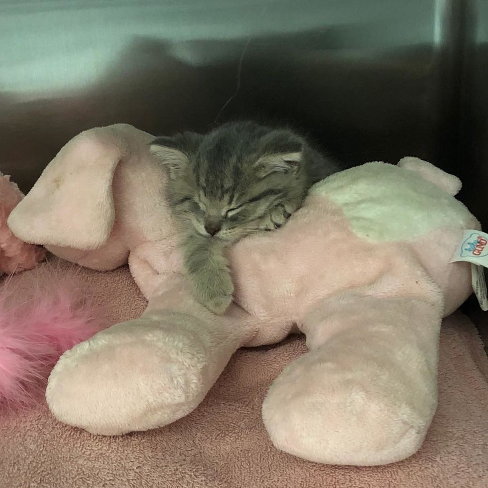One of the staffers gave the little kitten a stuffed animal to cuddle with. She snuggled right up and fell asleep on it.