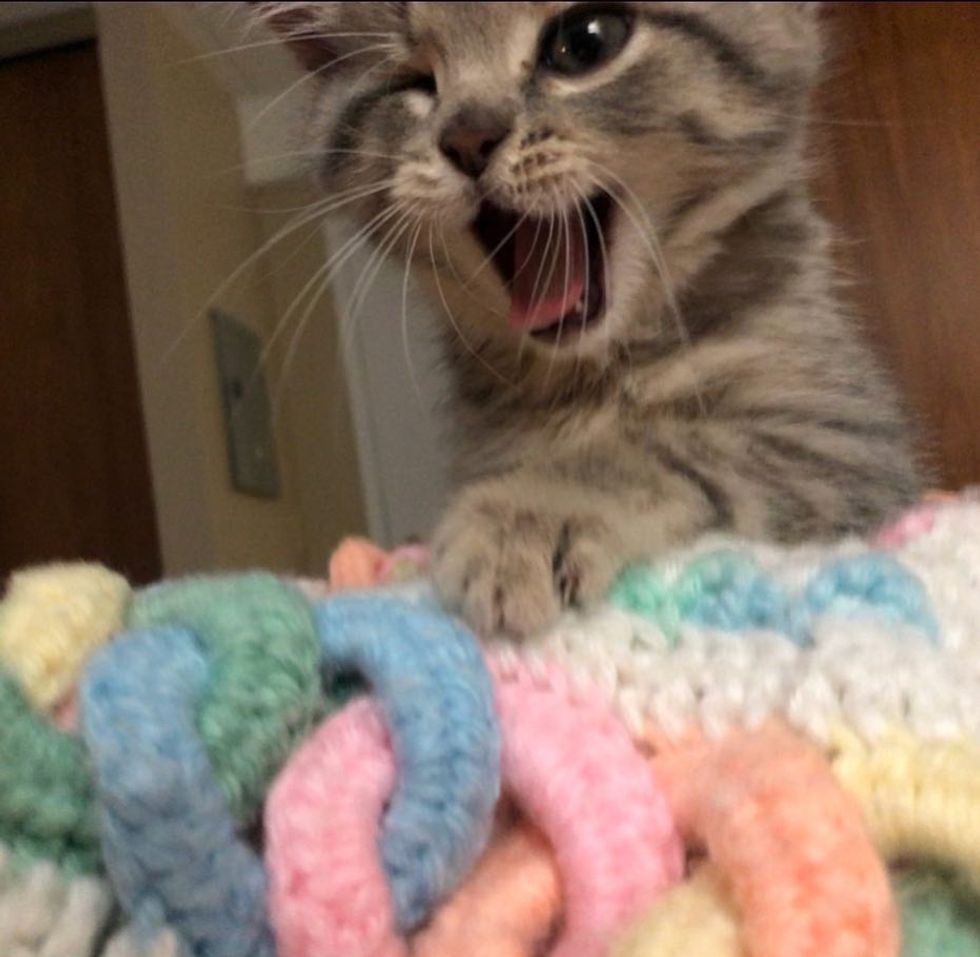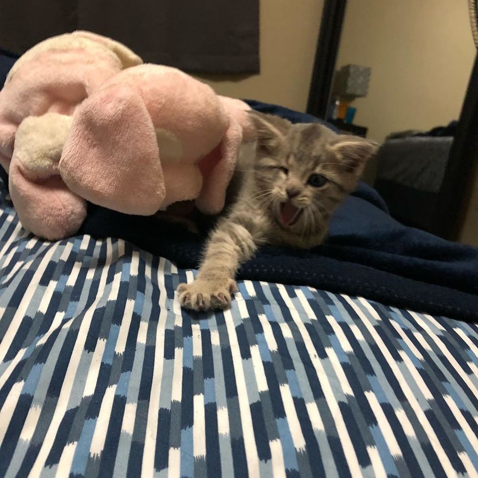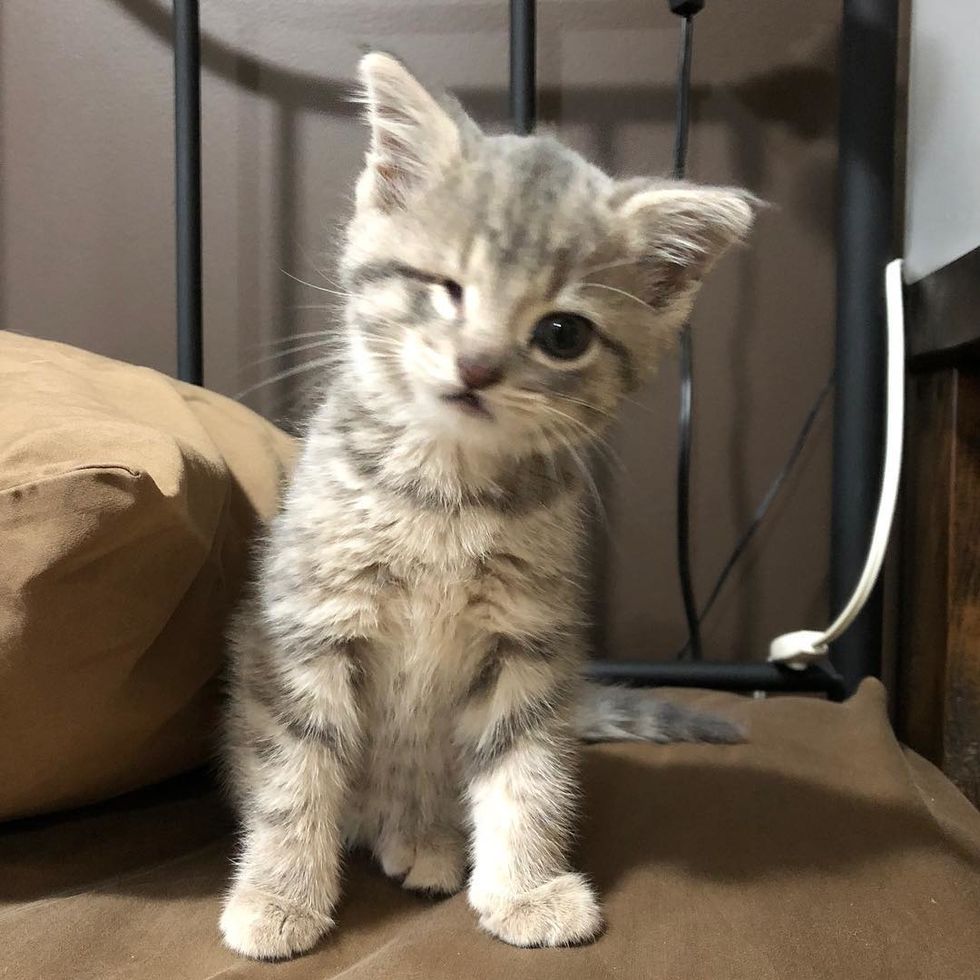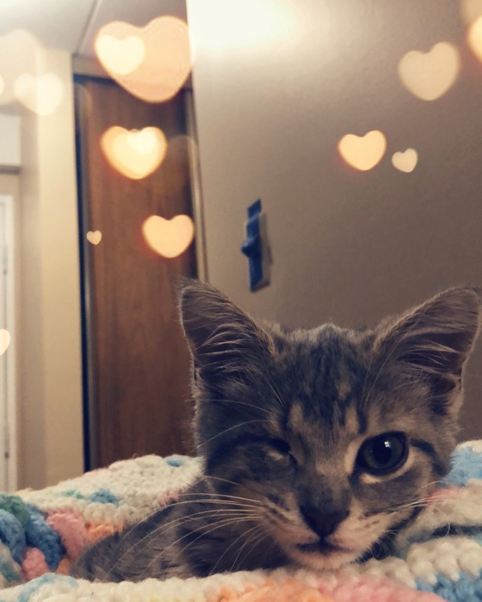 The little one-eyed wonder is tiny, but she has a larger-than-life purrsonality!