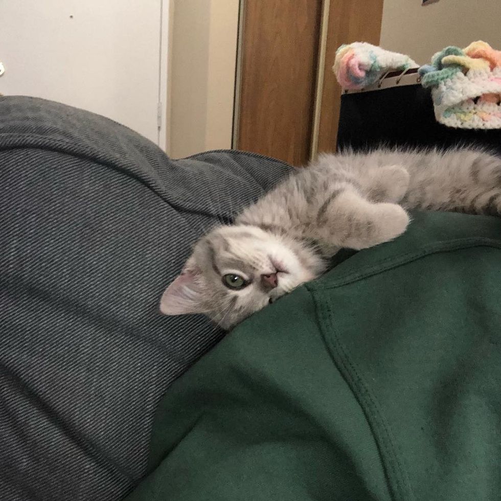 One of her favorite things is to snuggle with her human dad in his hoodie and to be carried around.