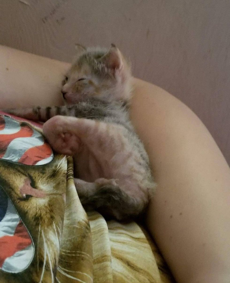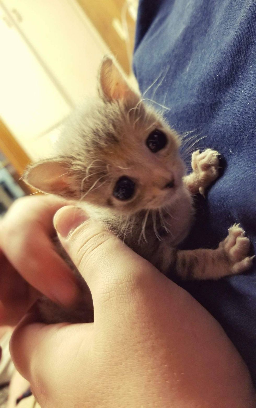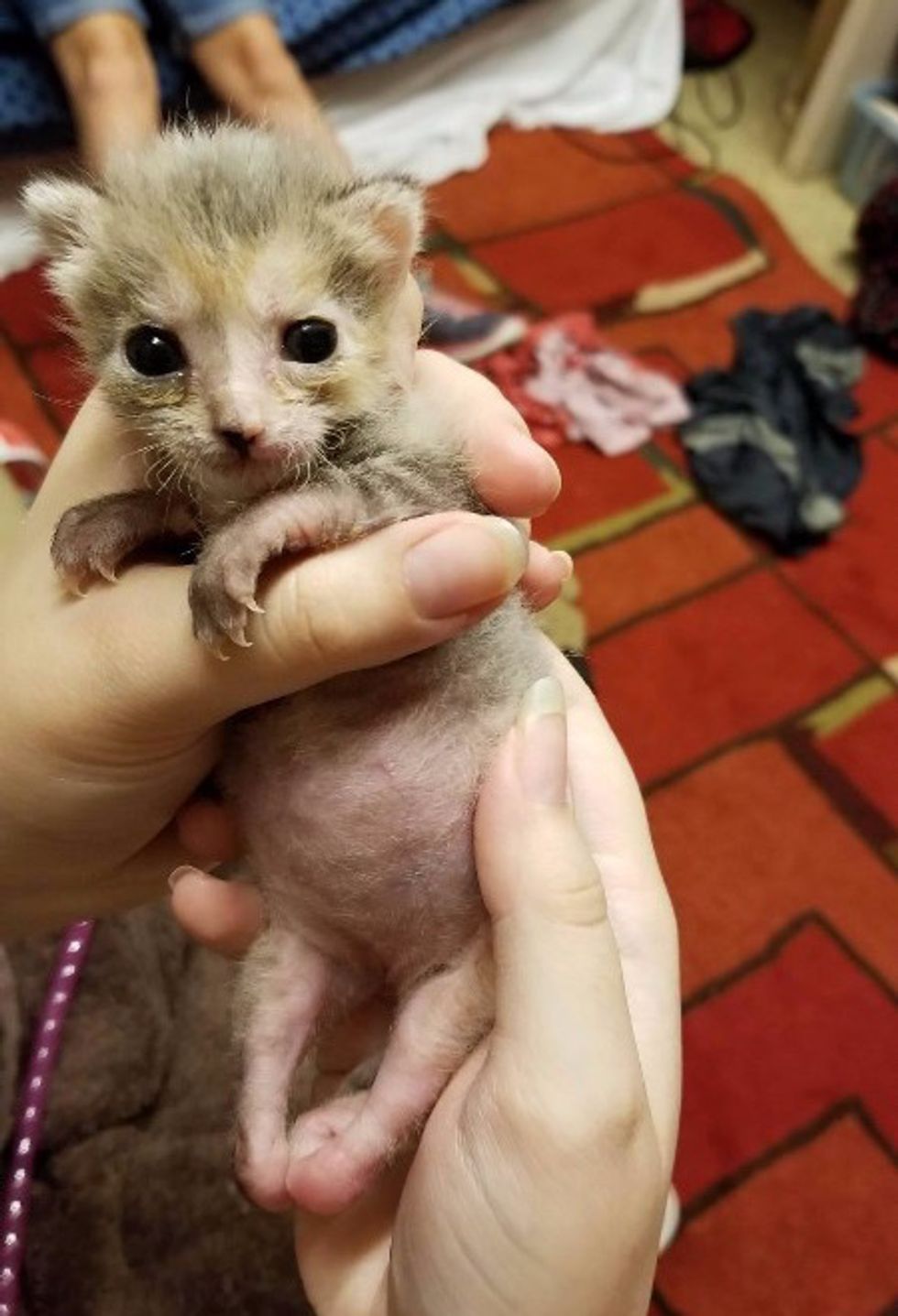 This miracle kitten is quite special. She was found lying alone on a porch after her mother left her there and never came back.