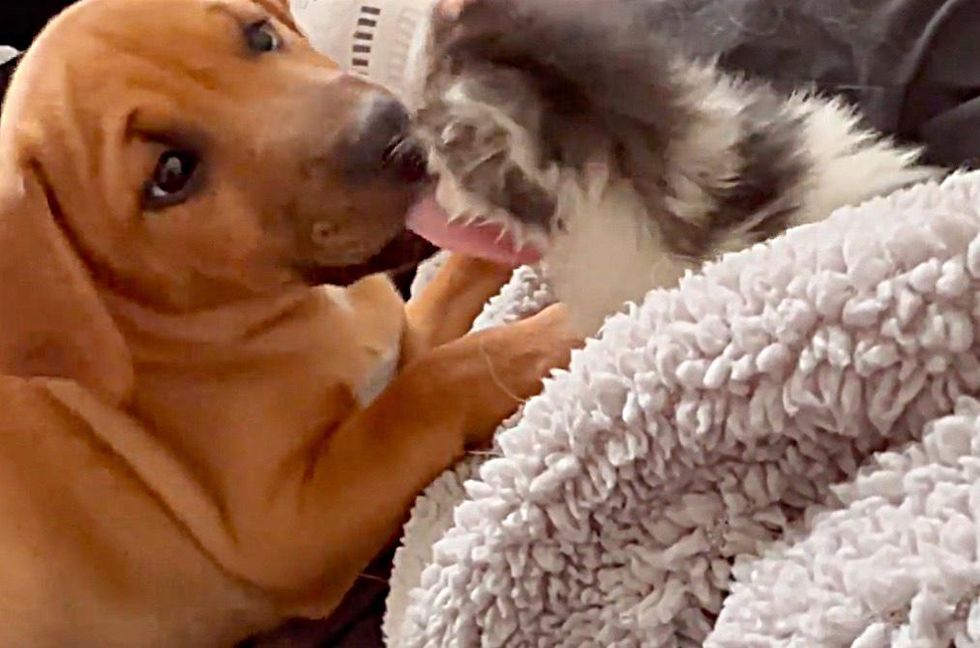 At the same time, Paula had a foster puppy named Ralfie from a different rescue organization. The sweet pup caught wind of the newcomer when he picked up the squeaky meows with his big floppy ears. "He was so curious about Grace and the feeling was mutual."