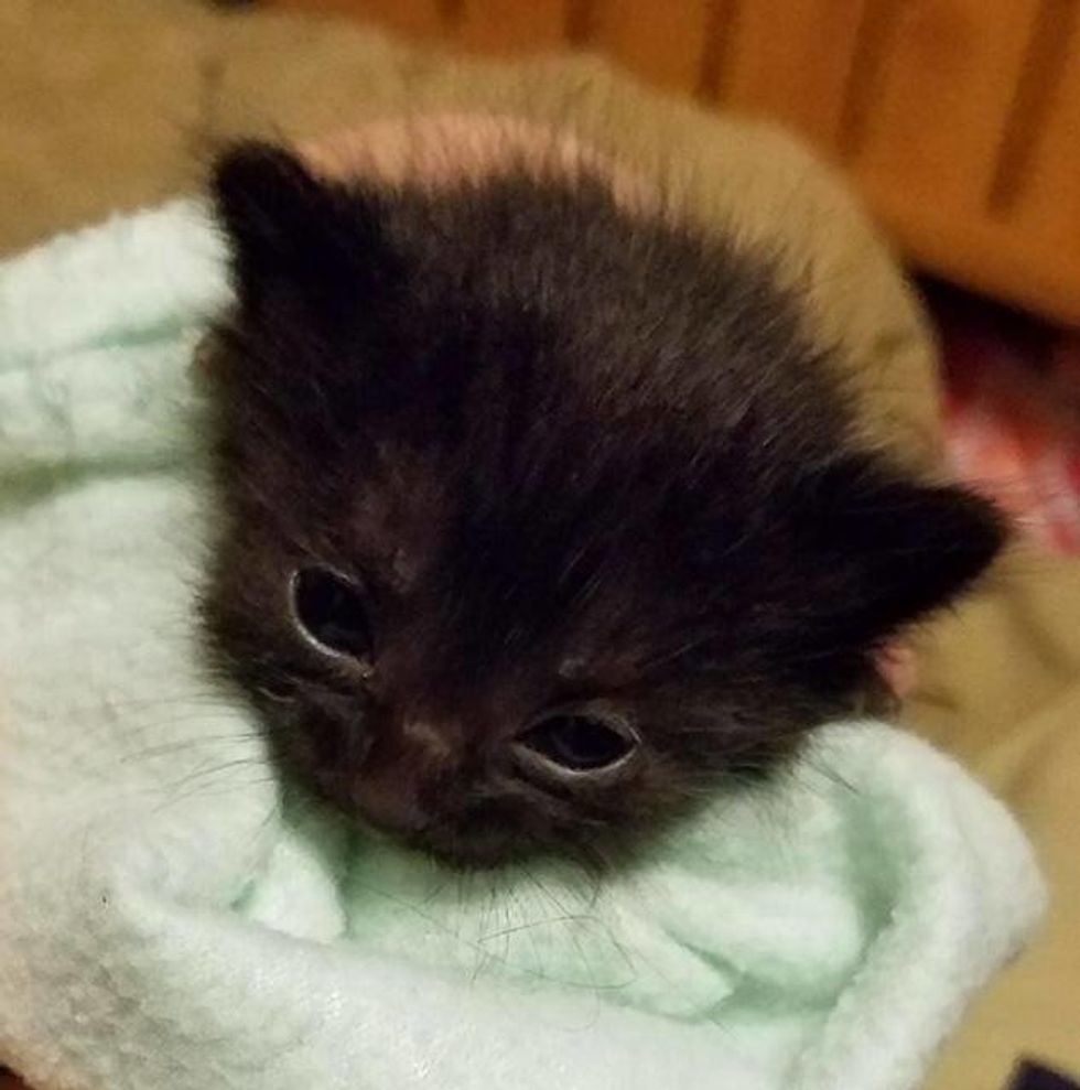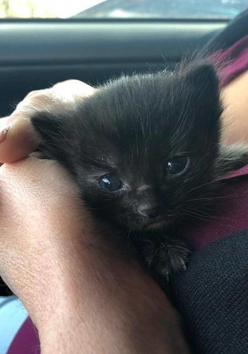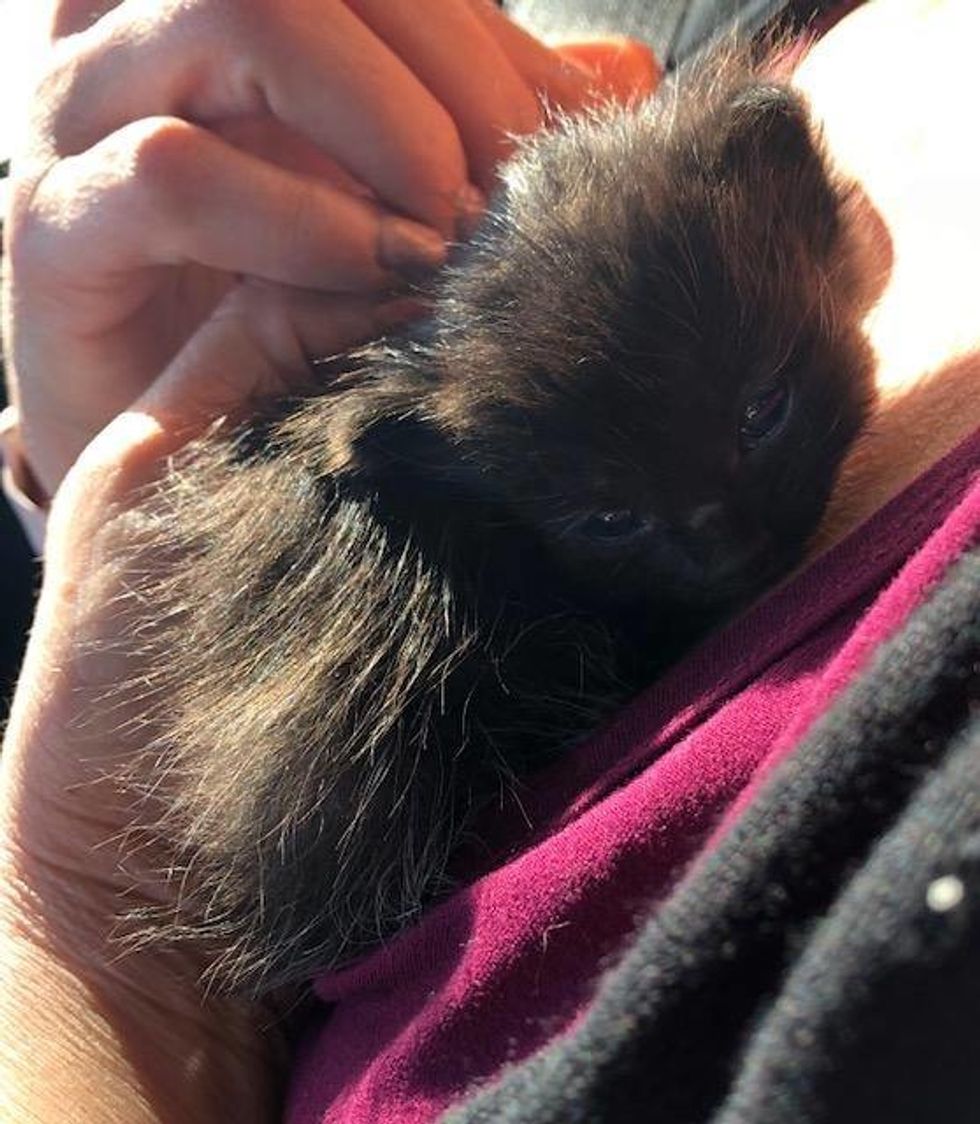 Last Friday, this little black kitten was spotted outside a store in Fresno after business hours. They searched around the area but couldn't find any other kittens nor the cat mom.