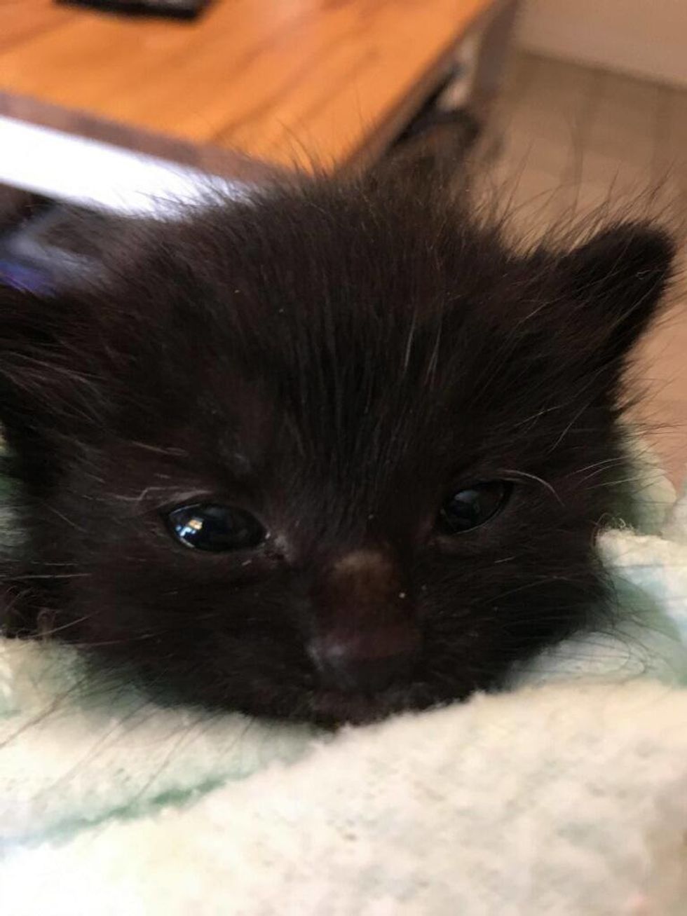 The itty bitty kitty who was saved from pouring rain, is now warm, well-fed, dry and doing much better in the comfort of a loving home.