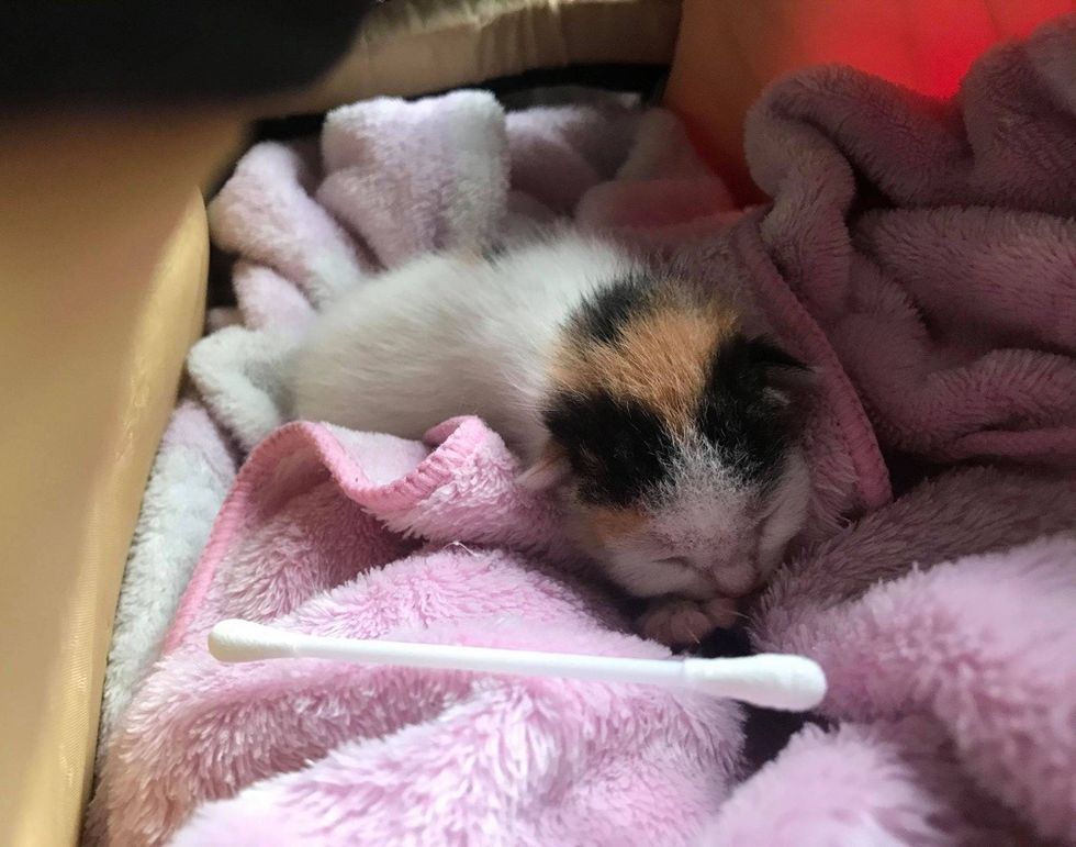 A Good Samaritan from Canada heard the cries of a kitten coming from outside one night. Upon investigation, she found a tiny feline baby all alone in a bush. The little calico was about one day old without a mother in sight.