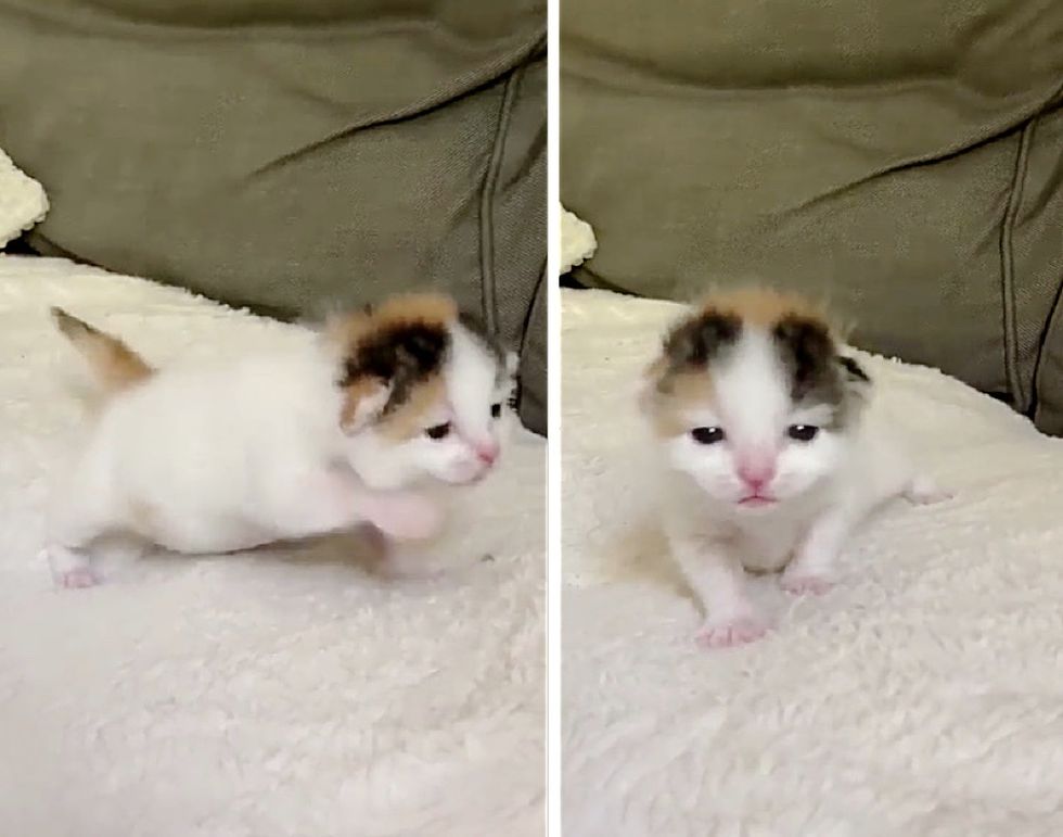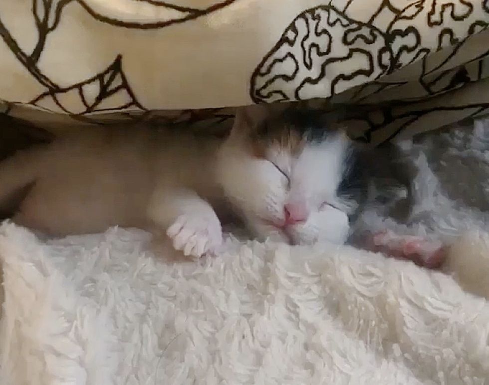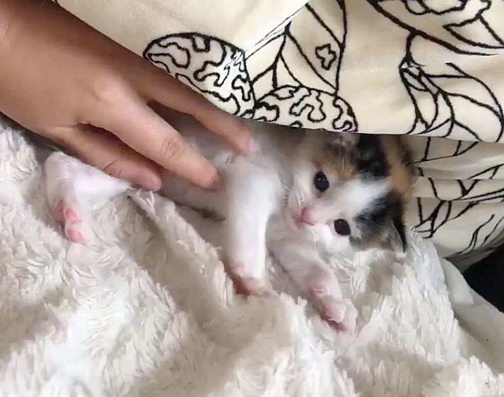 A palm-sized kitten was found alone in a bush without a mom. A kind lady heard her cries and knew she had to help.