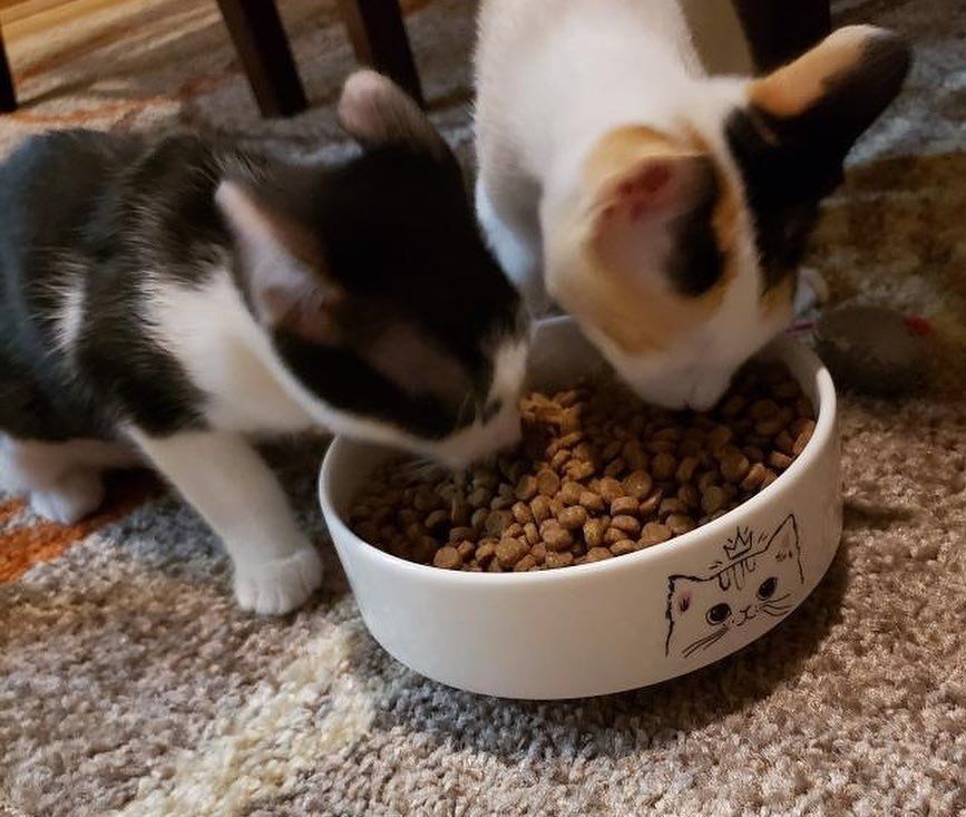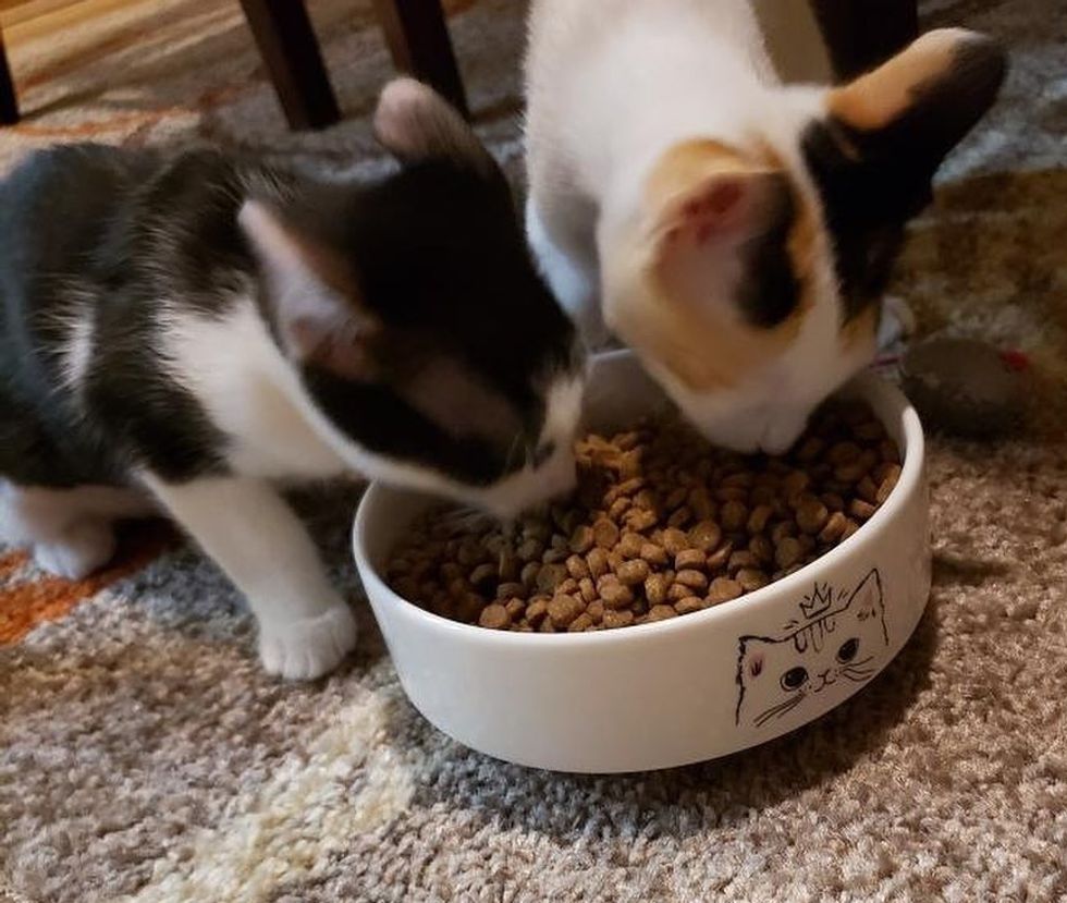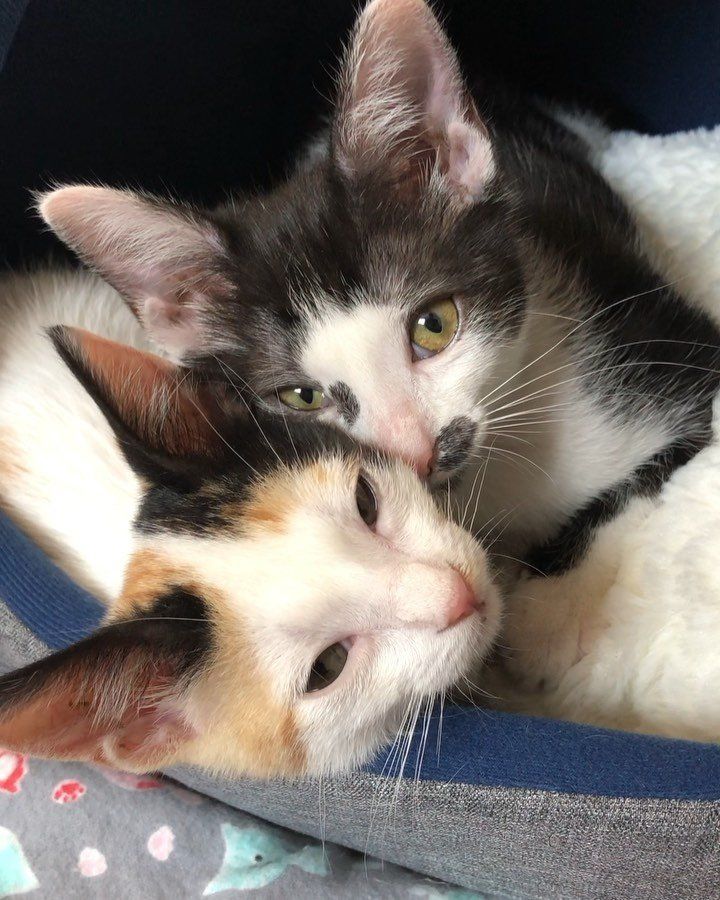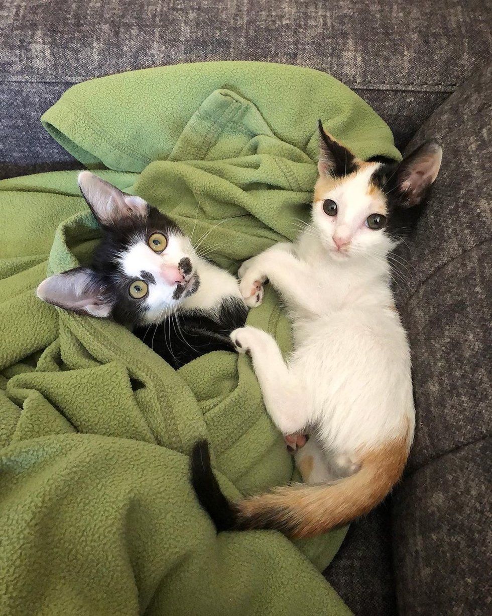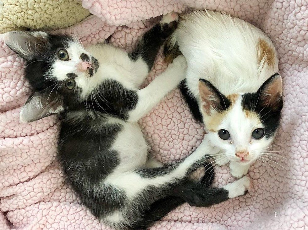 A tuxedo kitten who was found abandoned outside, bonded with a rescued calico who needed a friend.