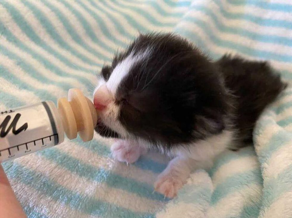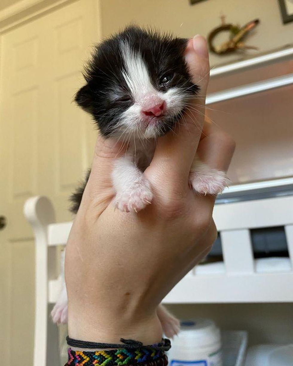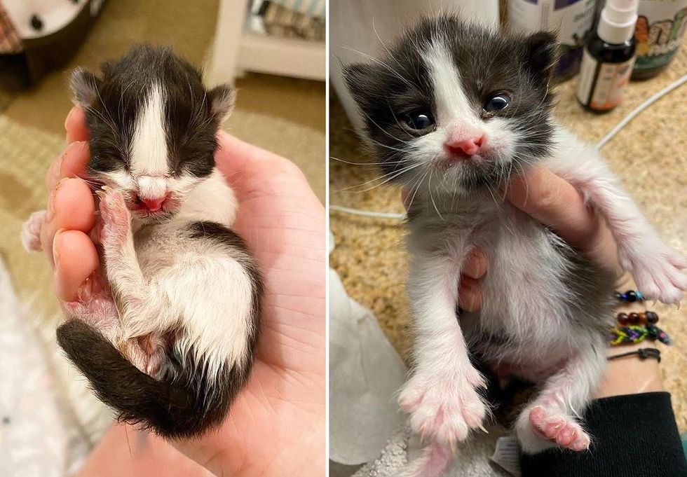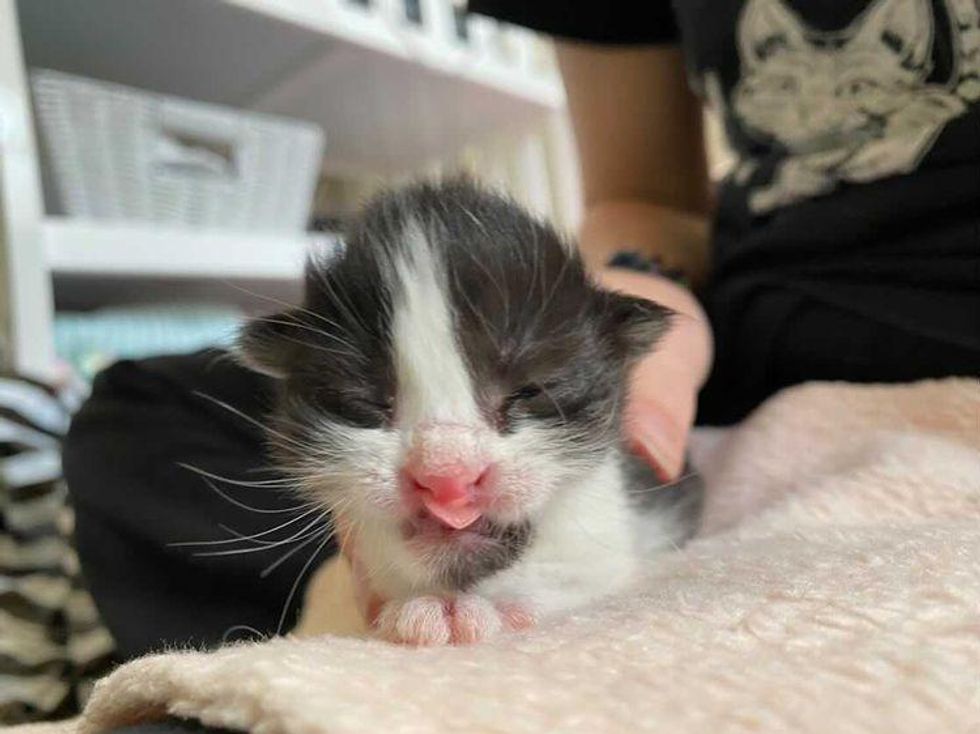 The kitten arrived with his umbilical cord still attached and eyes closed. Despite being so small, his will to live was strong from the start. Ashley sprang into action and took him into her care.