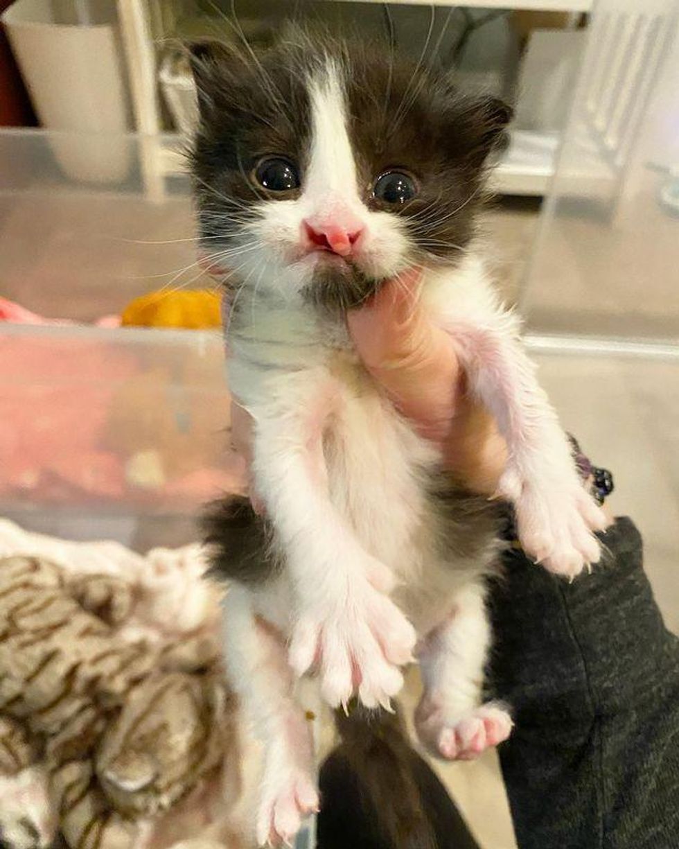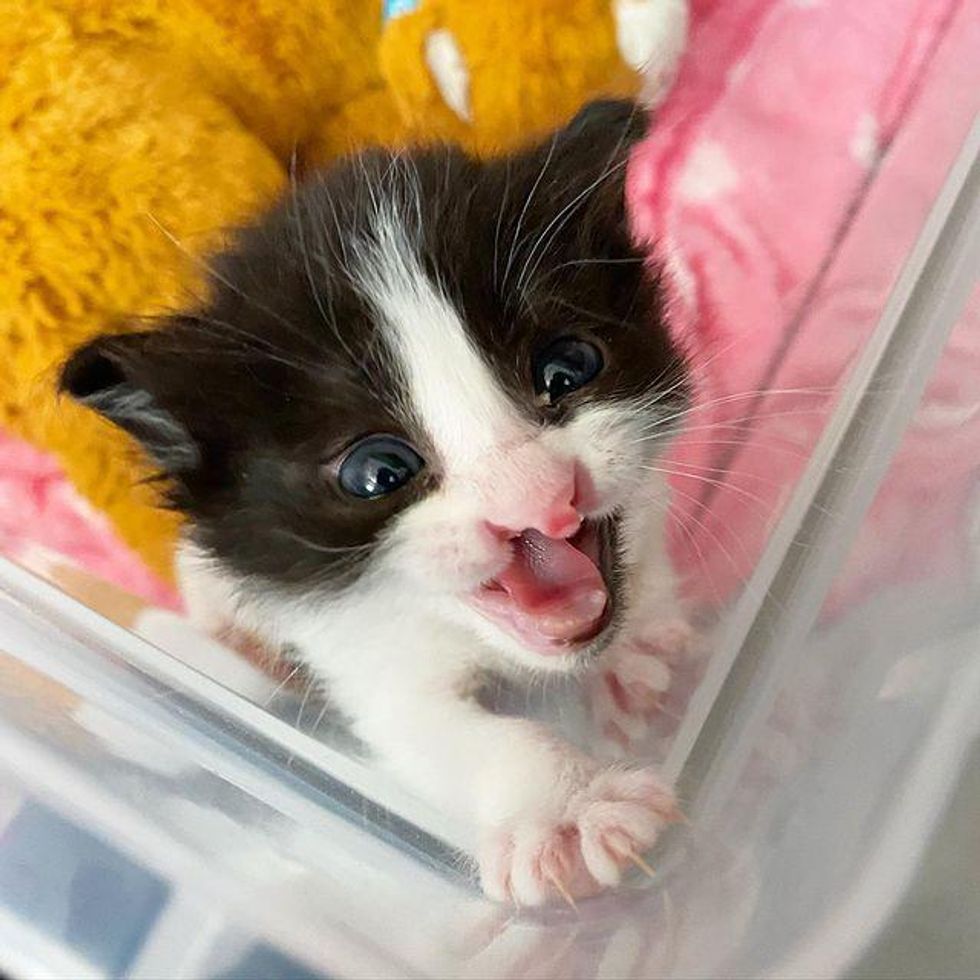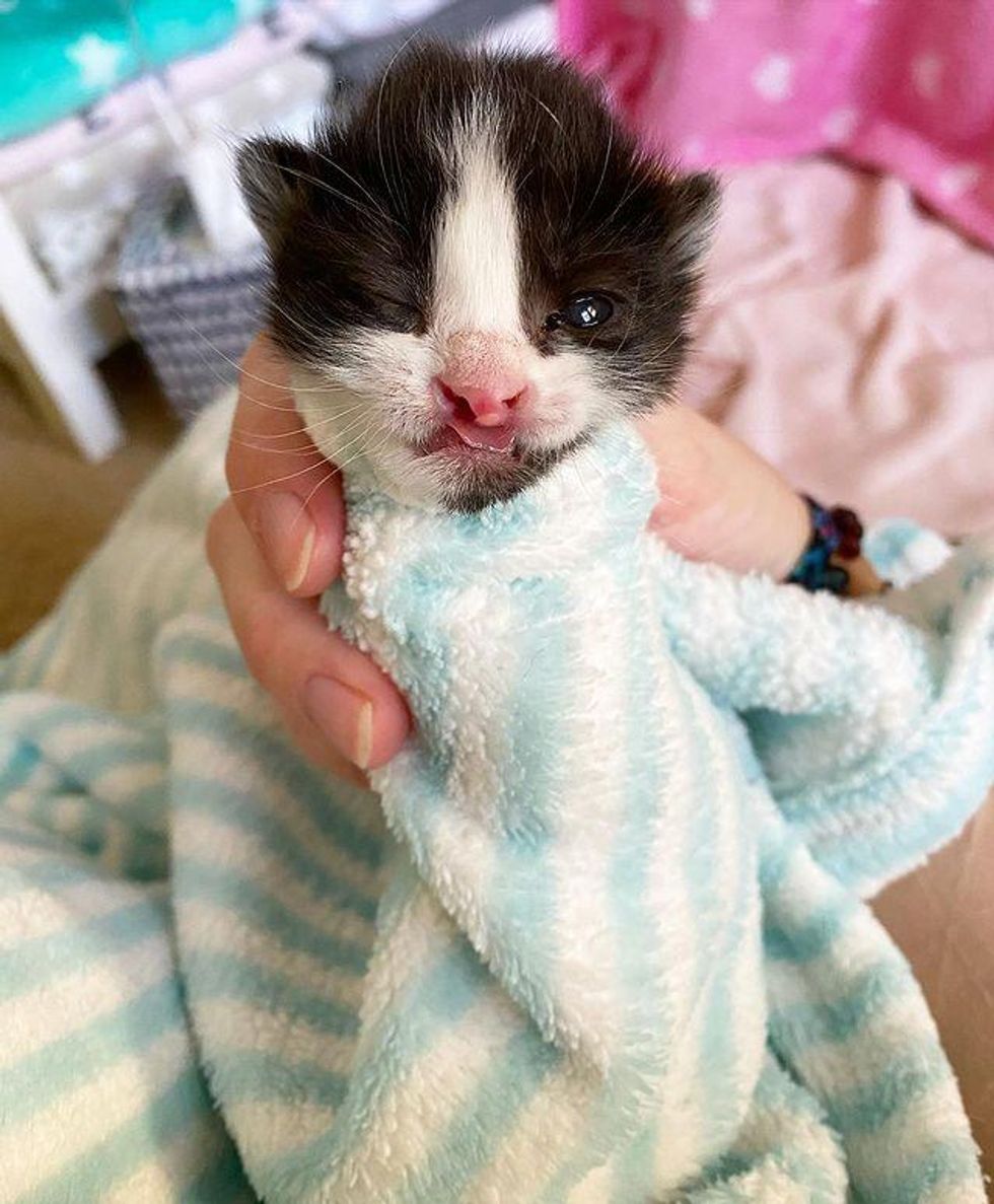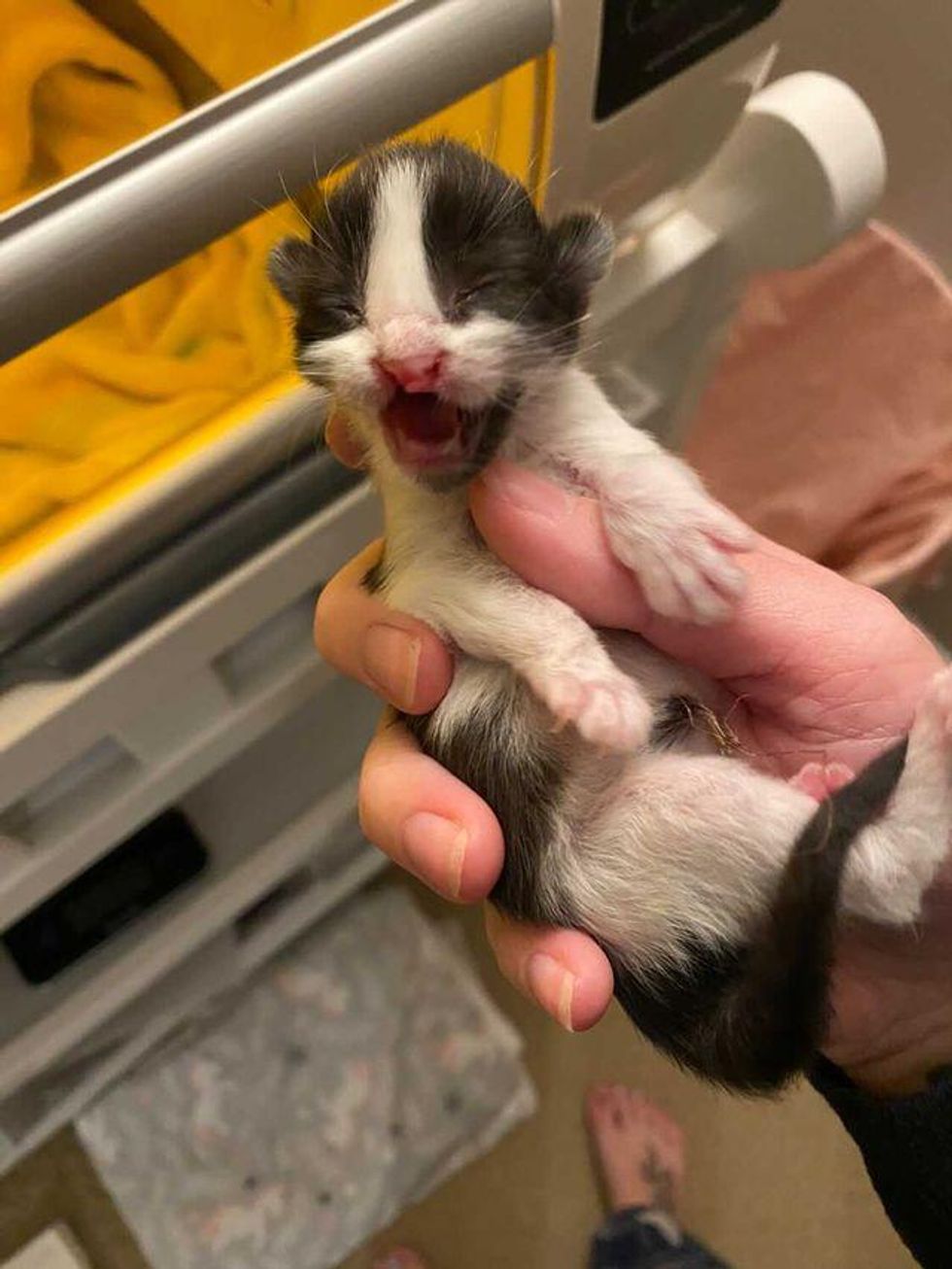 The kitten arrived with his umbilical cord still attached and eyes closed. Despite being so small, his will to live was strong from the start. Ashley sprang into action and took him into her care.