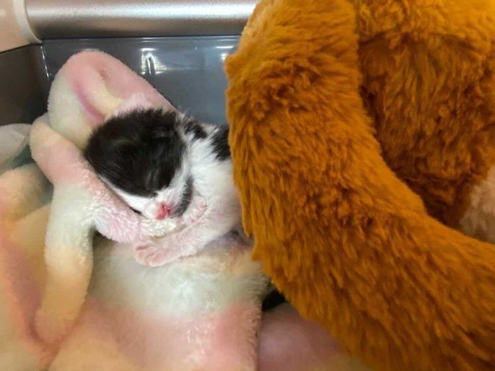 The kitten was placed in an incubator with soft blankets and snuggle toys surrounding him. He fell fast asleep in the comfort of his warm bed, and was so content with a full belly.