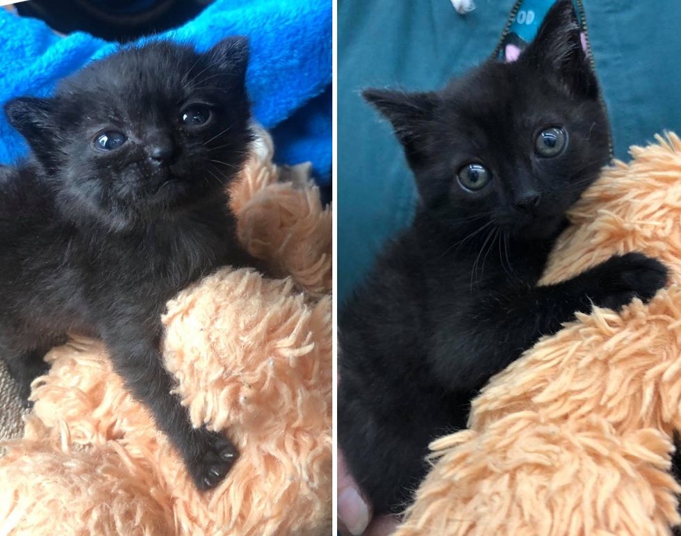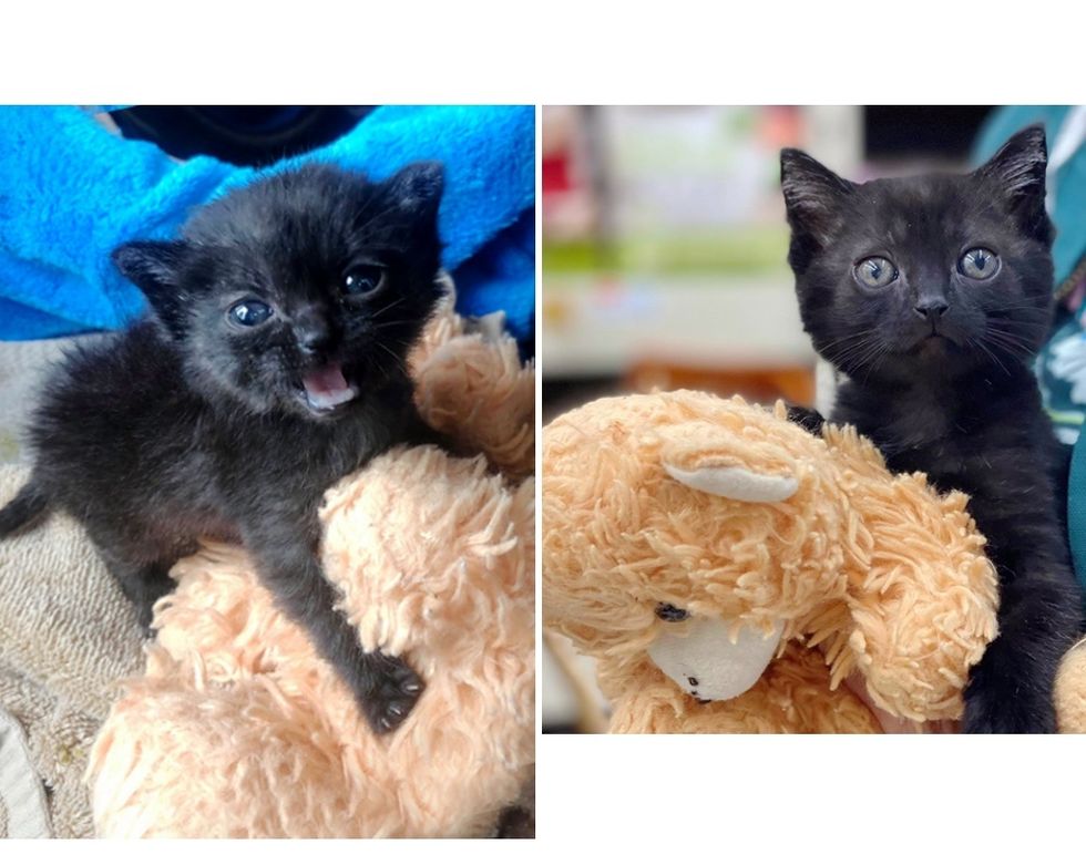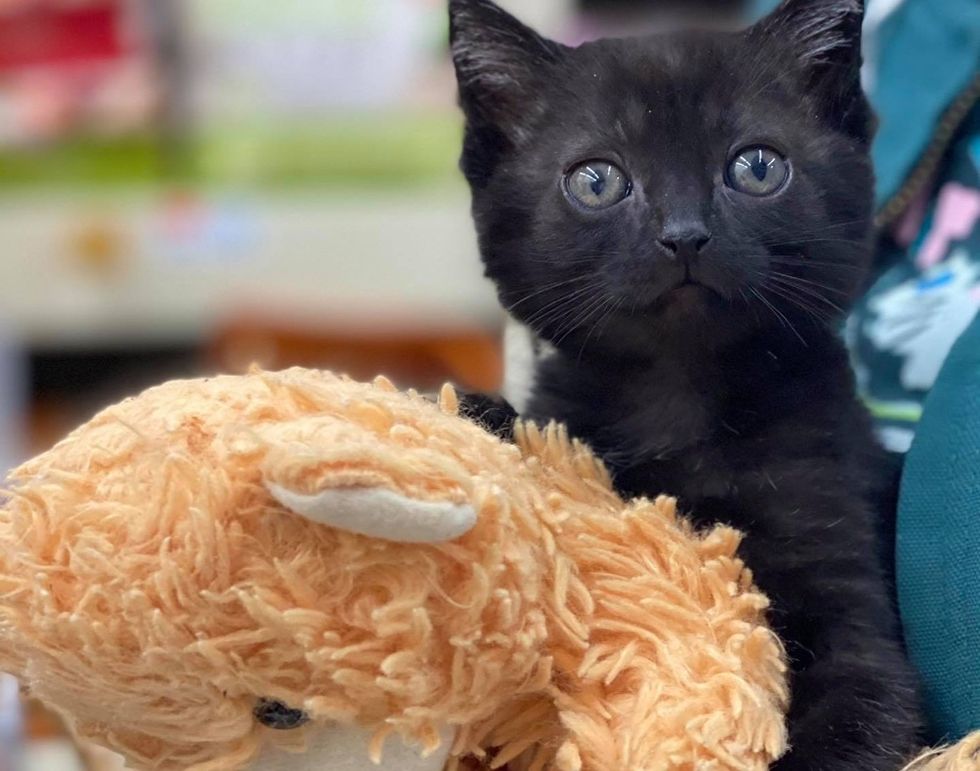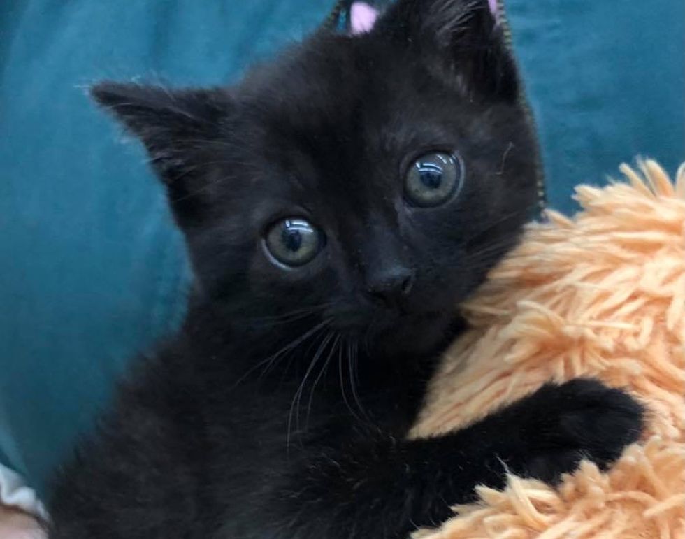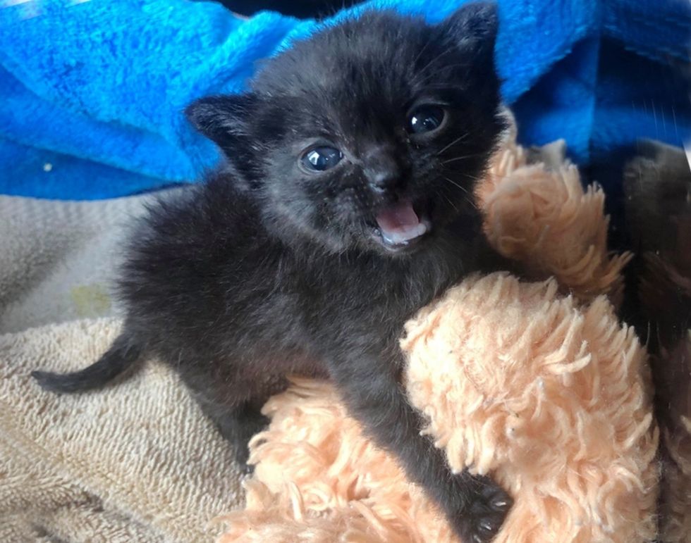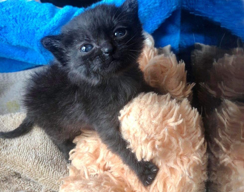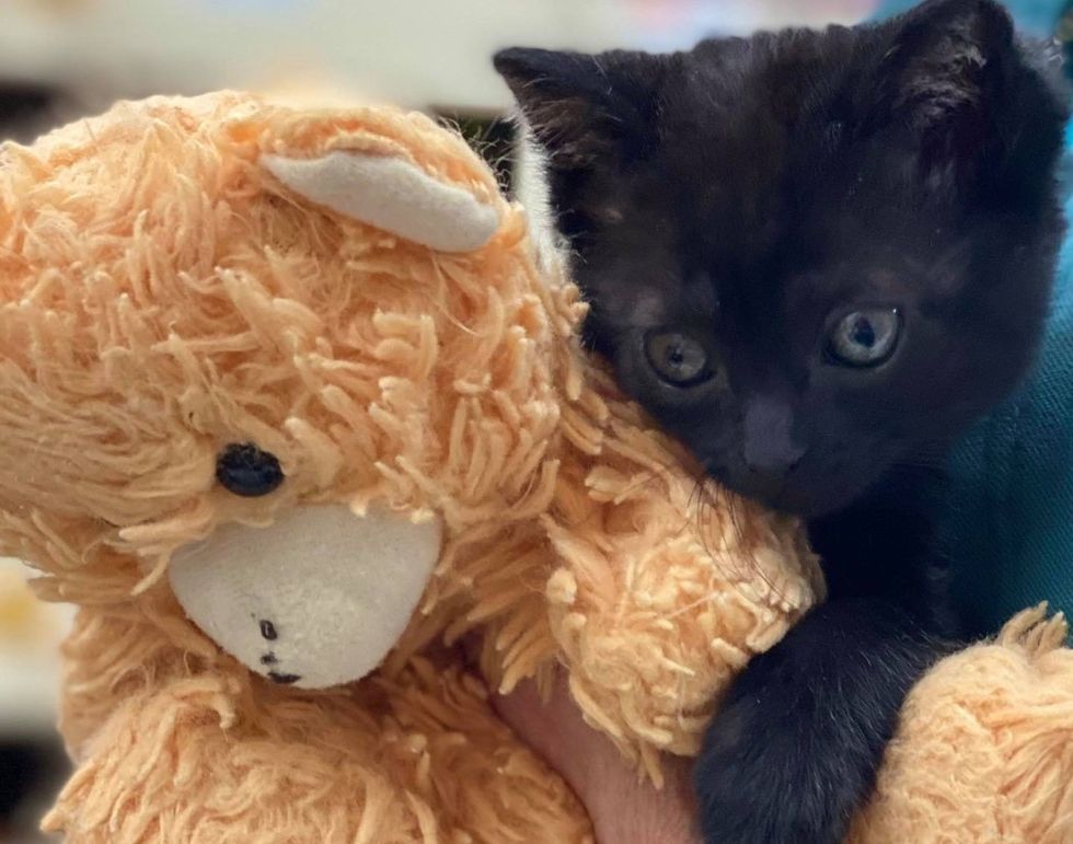 This sweet kitten has been carrying her trusty teddy bear everywhere she goes, since she was found outside alone.