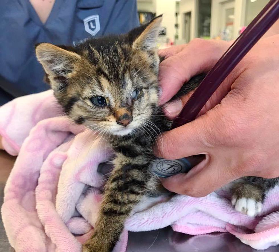 When the homeowner came out to check on the kitten, she realized that the tabby was sickly and missing one eye. The family waited for the mother cat to come back but she never returned.