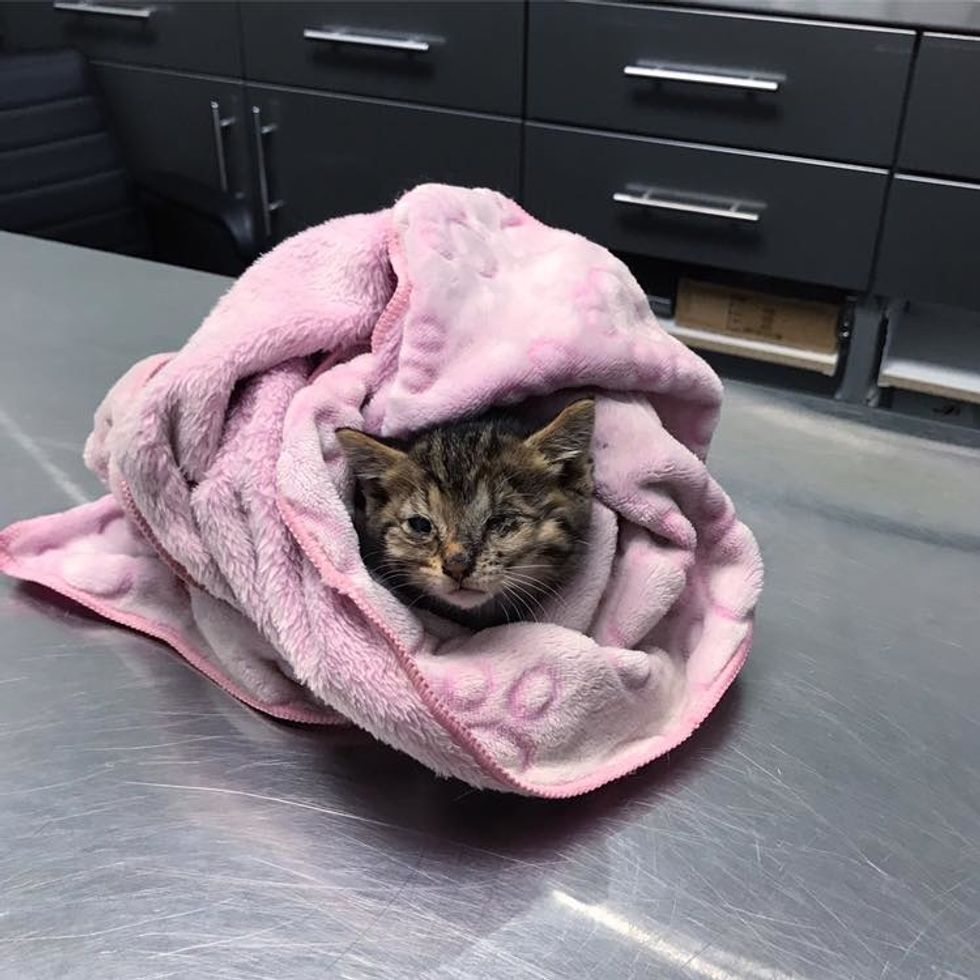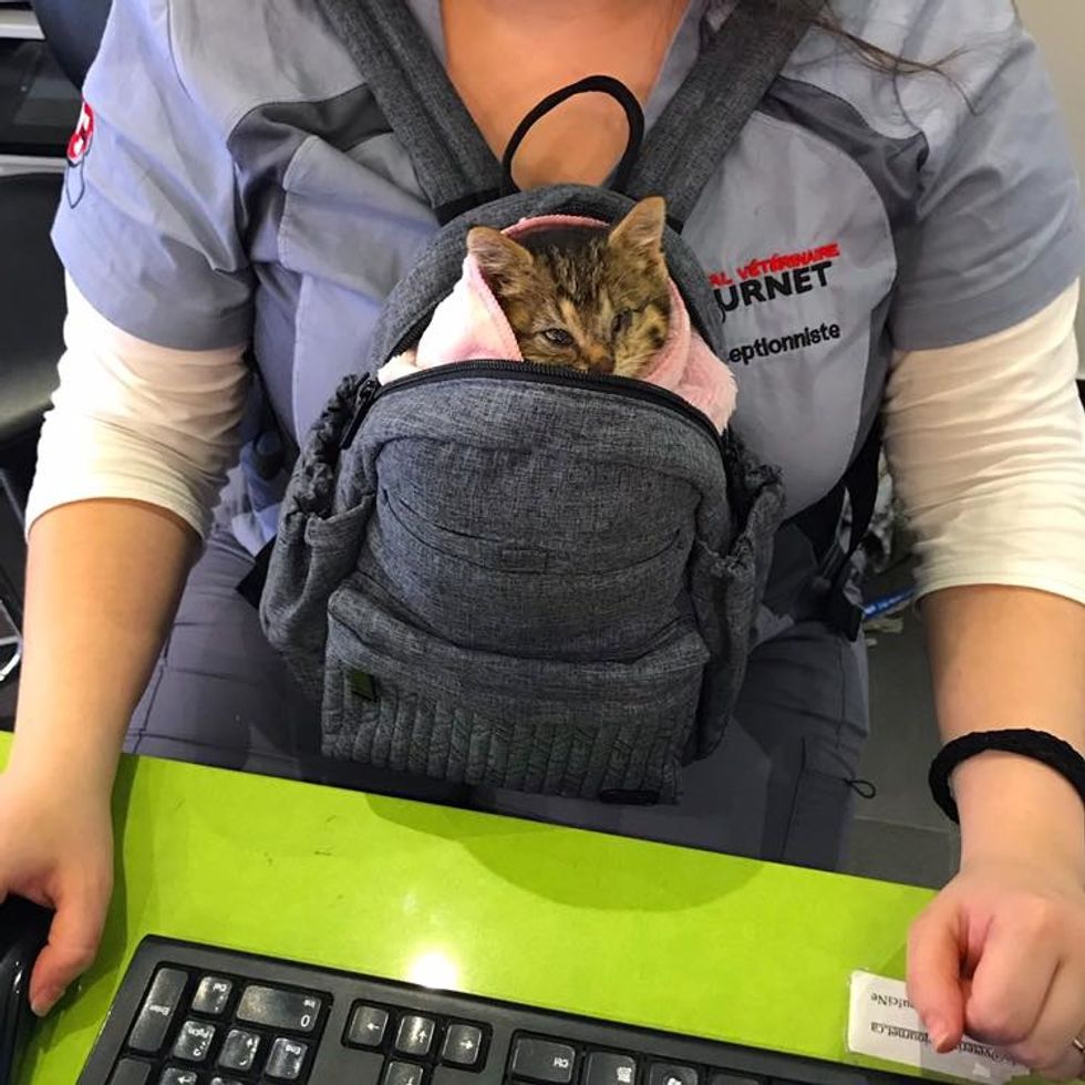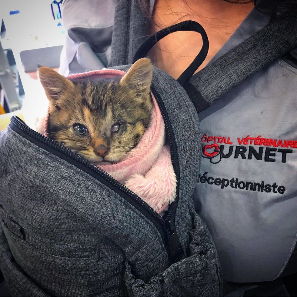 They knew the kitten needed their help and brought her to a veterinary clinic (Hôpital Vétérinaire Journet) for medical attention. Chatons Orphelins Montréal, a local rescue group, stepped up to help and took the little one into their care.