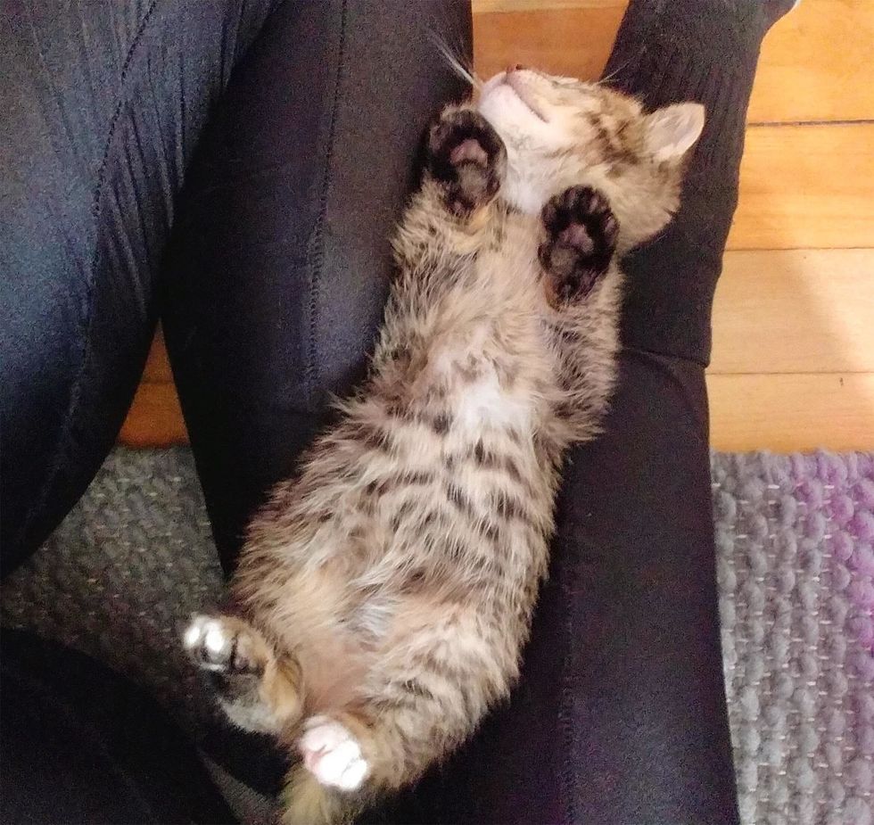 "Unna had to be socialized to learn to love this new life with humans. When she's wrapped up in a purrito, she loves it and falls asleep in it," Celine said.