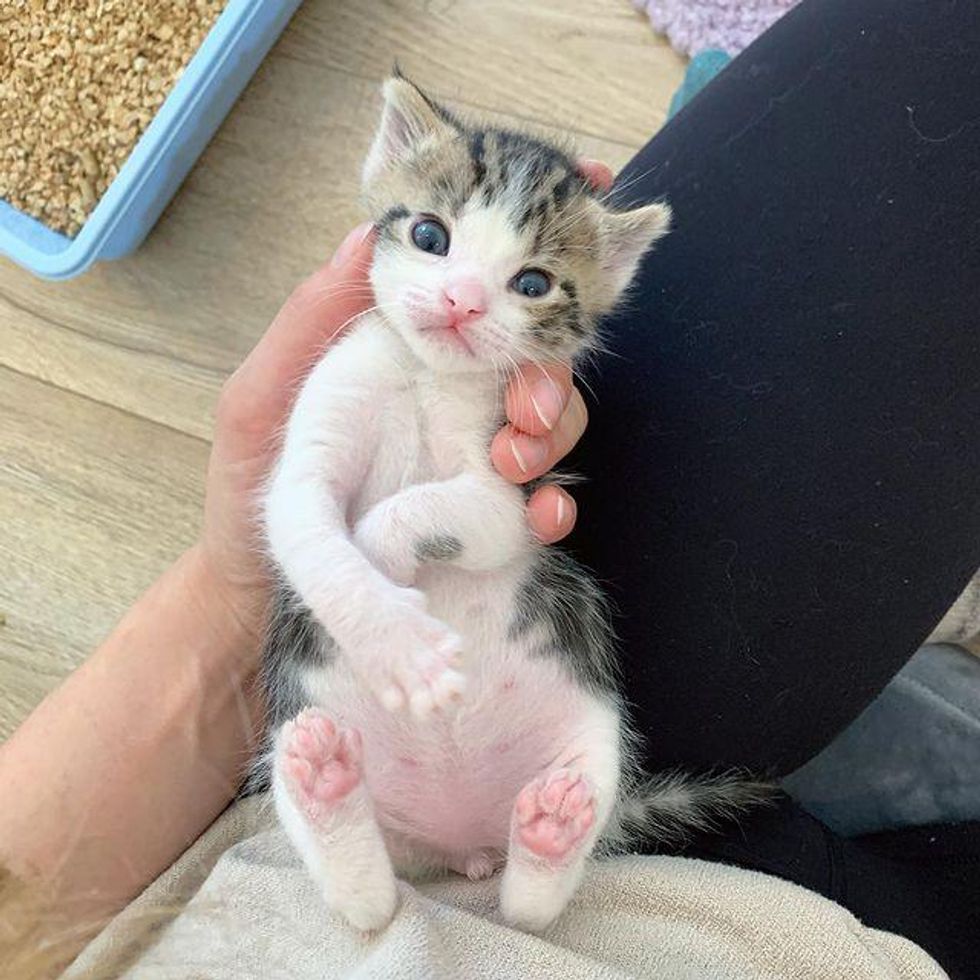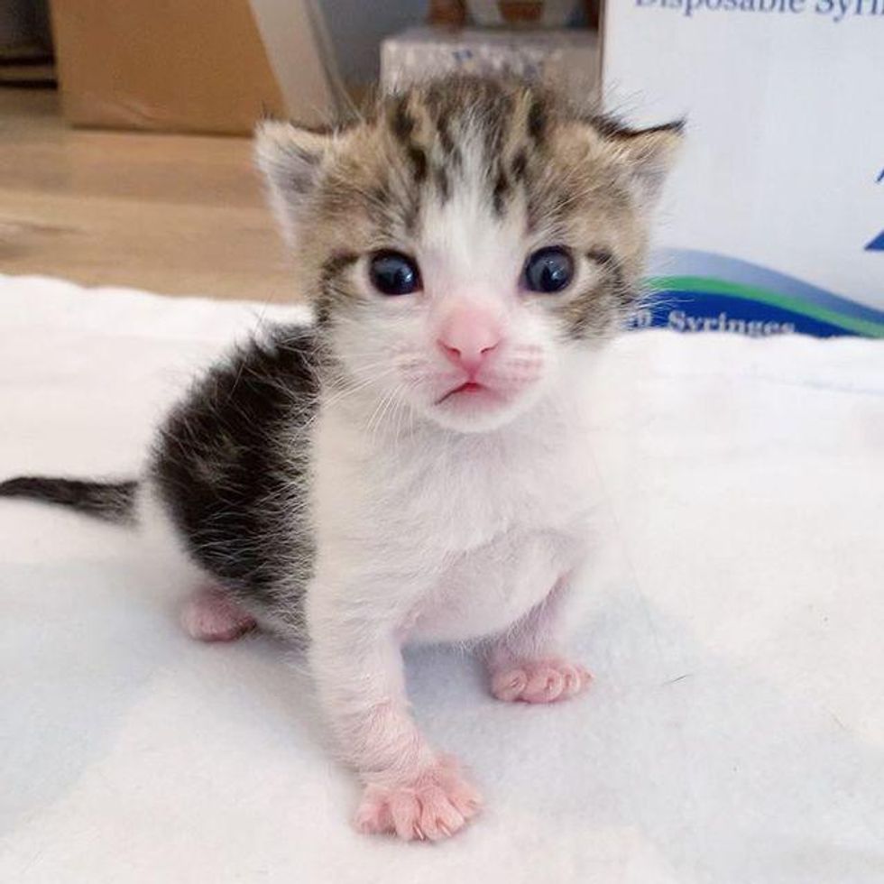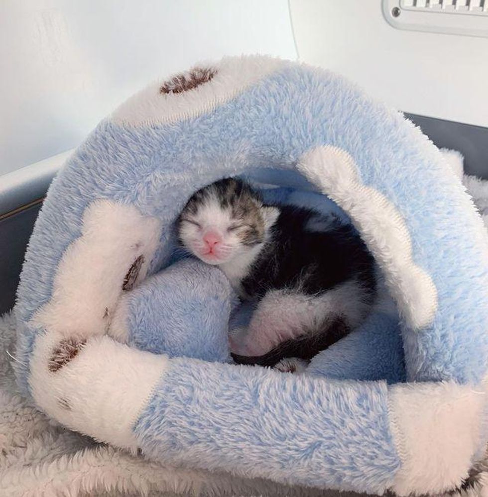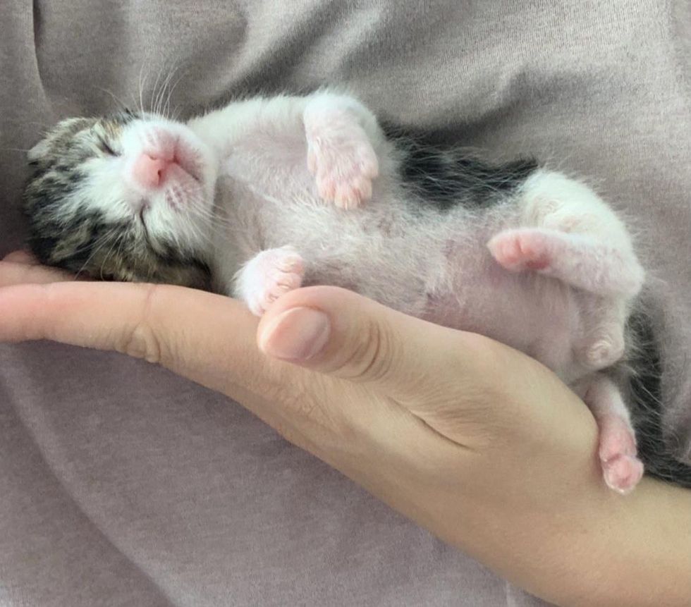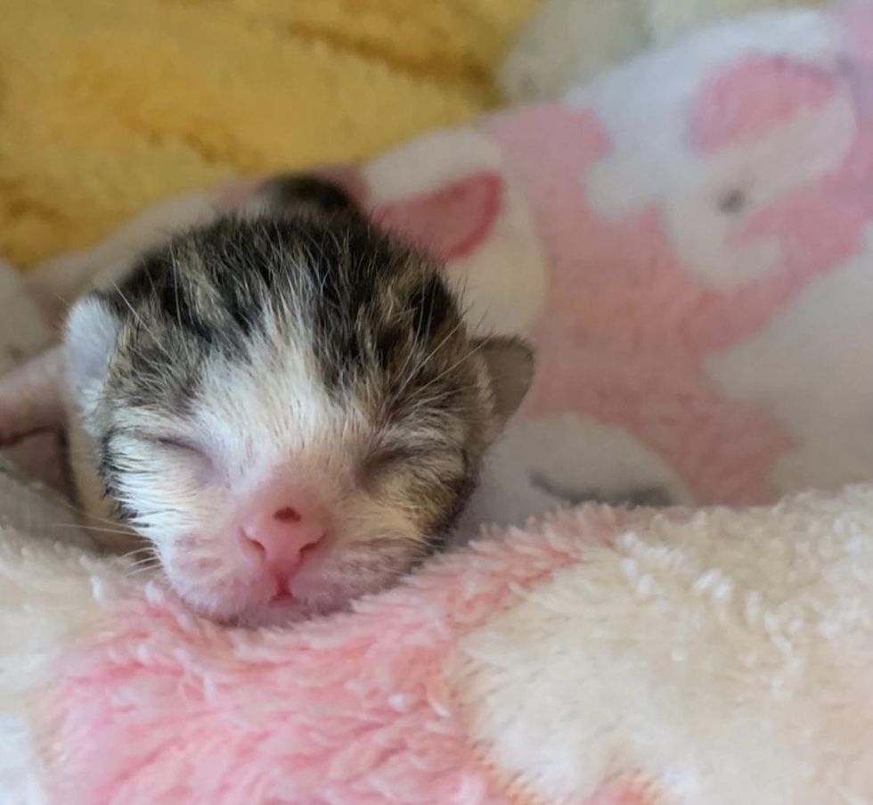 A tiny kitten was found left behind as a newborn and brought back from the brink in the nick of time.