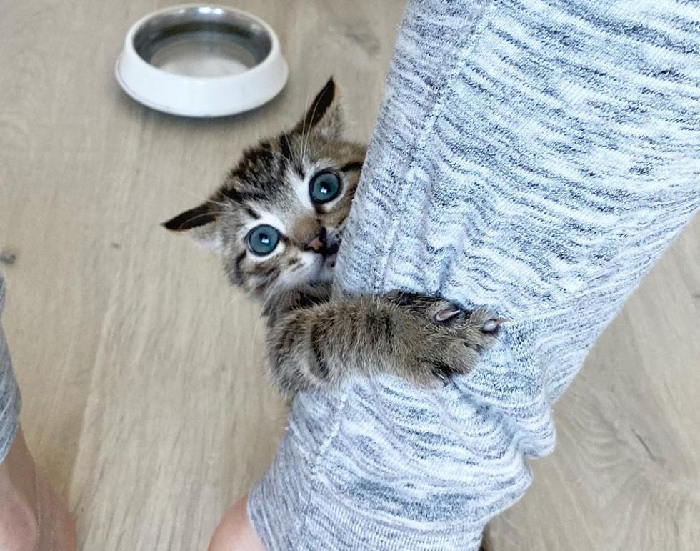 The fearless little tabby wants nothing more than snuggling with his favorite person. He will grab her leg and bear hug it or rub his face against hers — it is his love language.