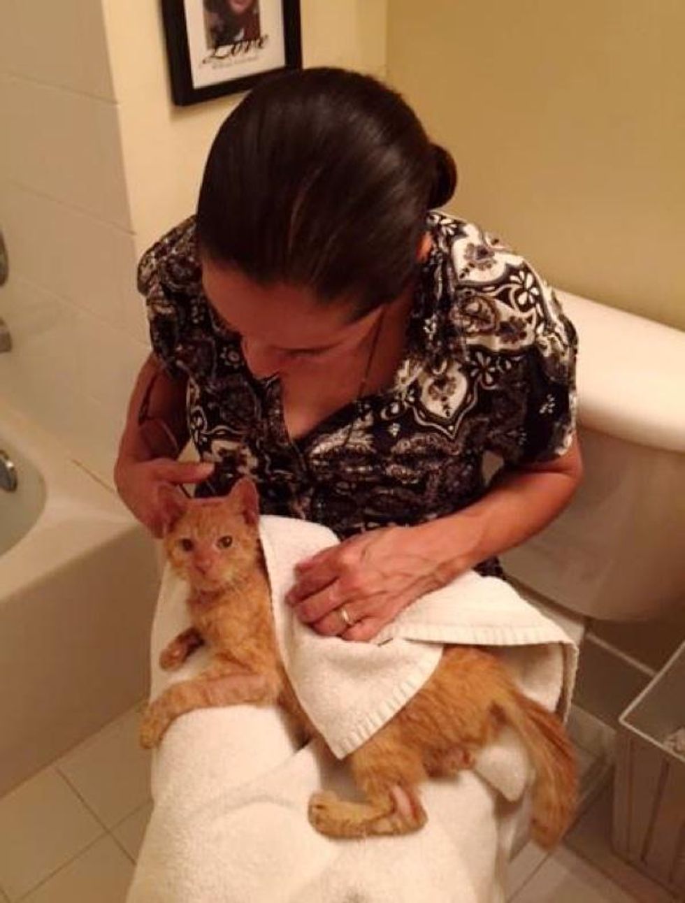 Cuddling with his rescuer in her lap, purring away.