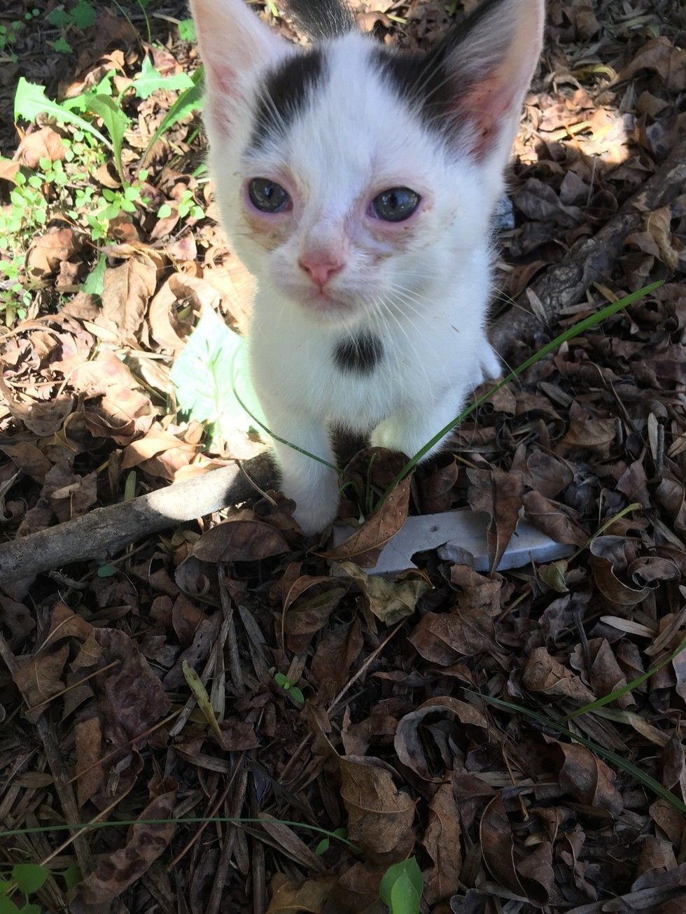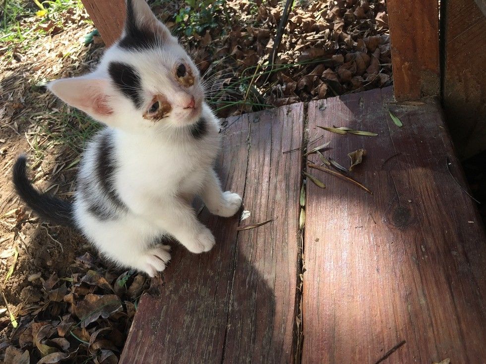 A tiny kitten with infected eyes crawled out from under the porch and walked up to the owner of the property, meowing for help.