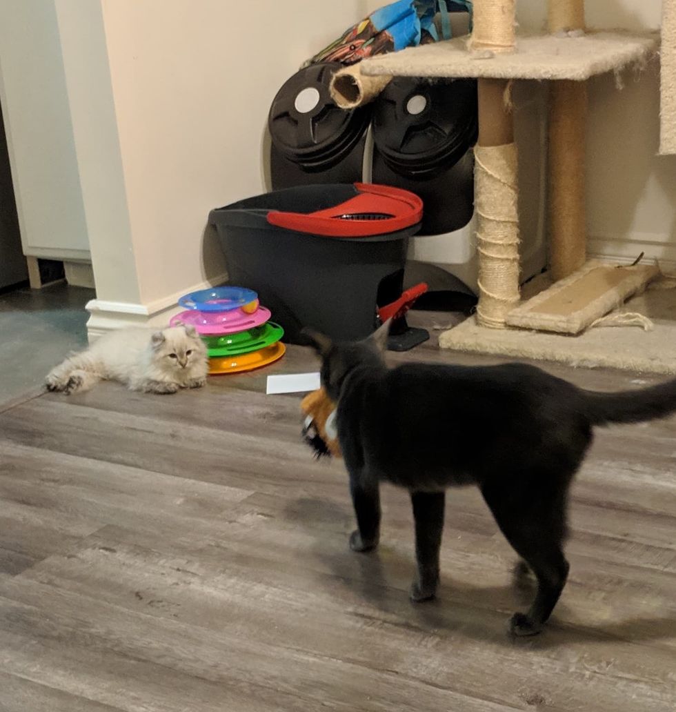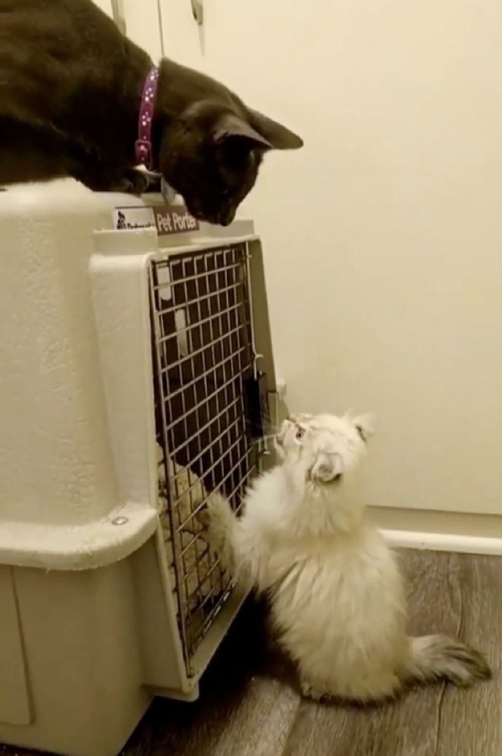 As soon as Wolfie came down from the carrier, Tater swooped in for some cuddles. The little bundle of fluff switched on his purr motor while rubbing his face all over his new friend.