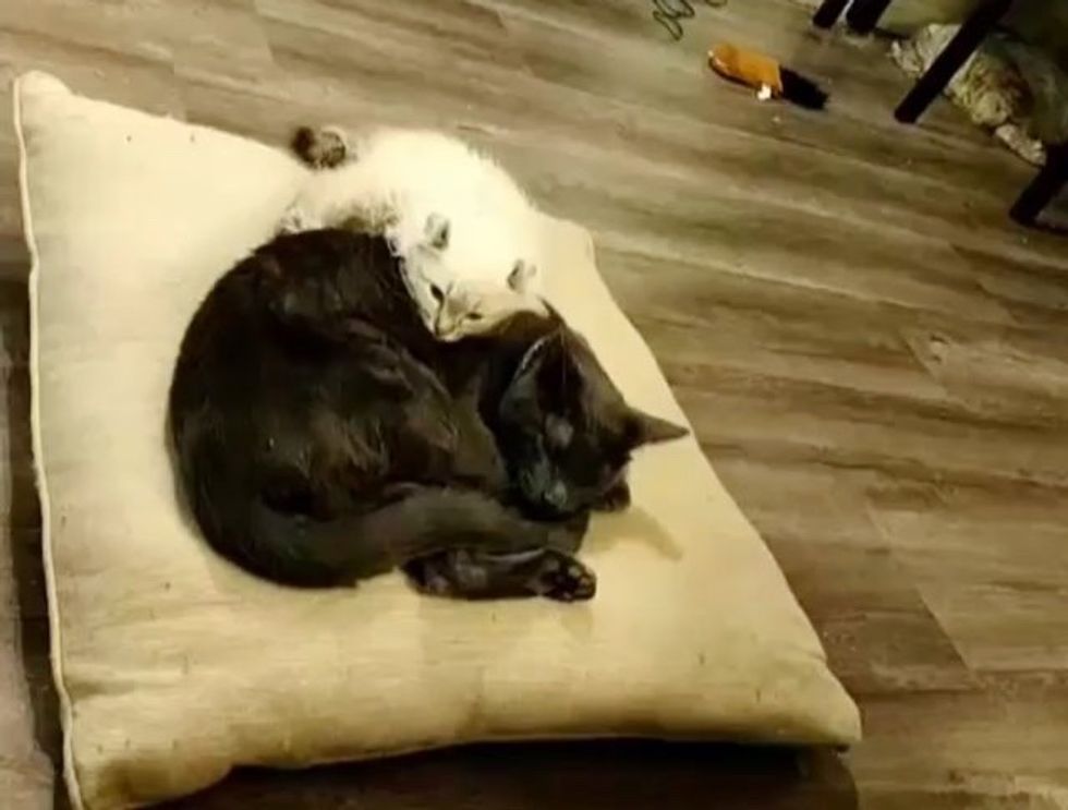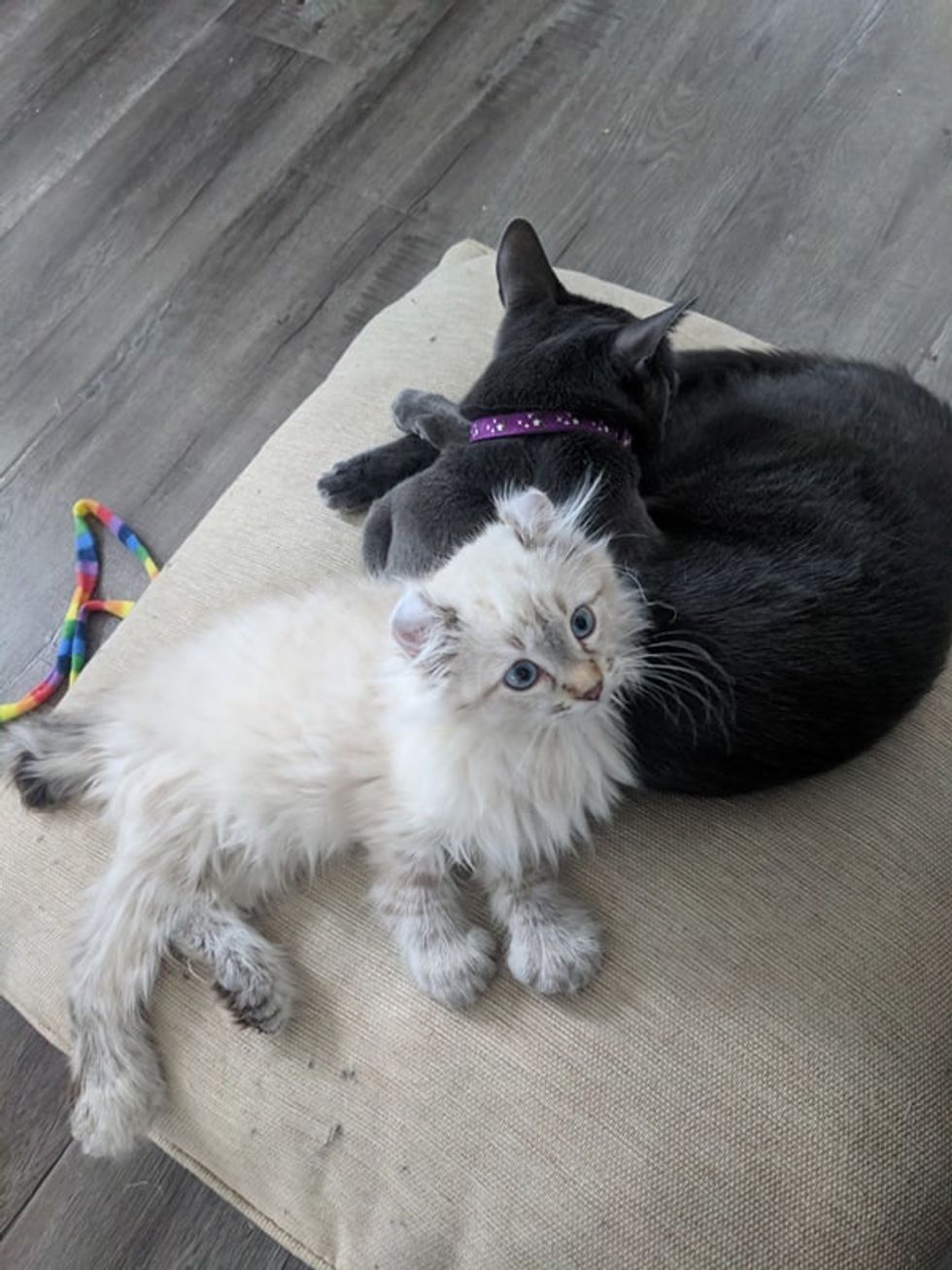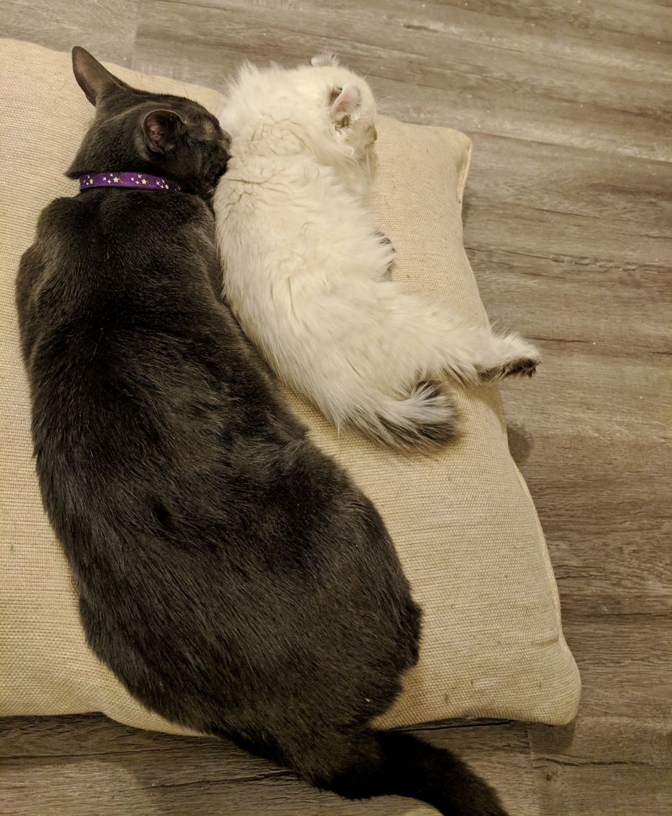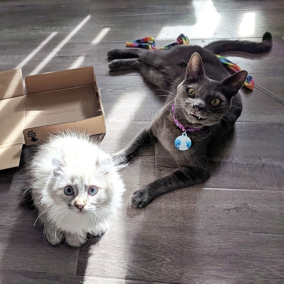 Wolfie was like a big brother to Tater, teaching him all the tricks to be a cat. He introduced his tiny protegé to his very first cardboard box and showed him the meaning of "if it fits, I sits."
