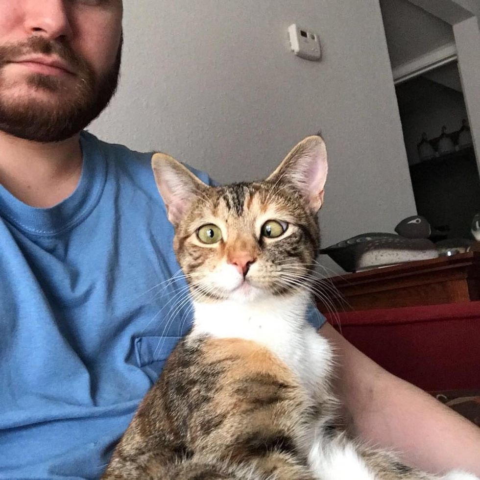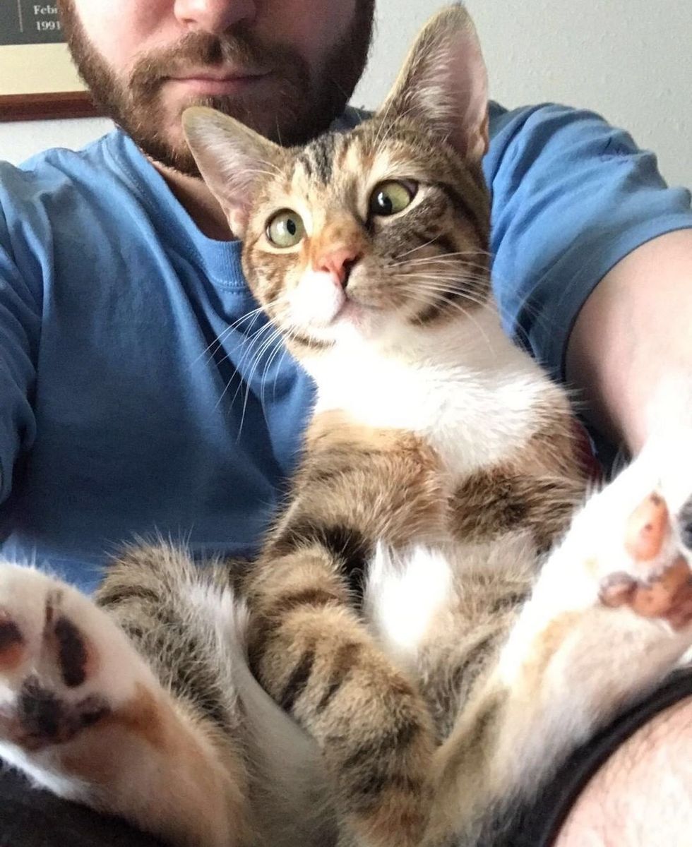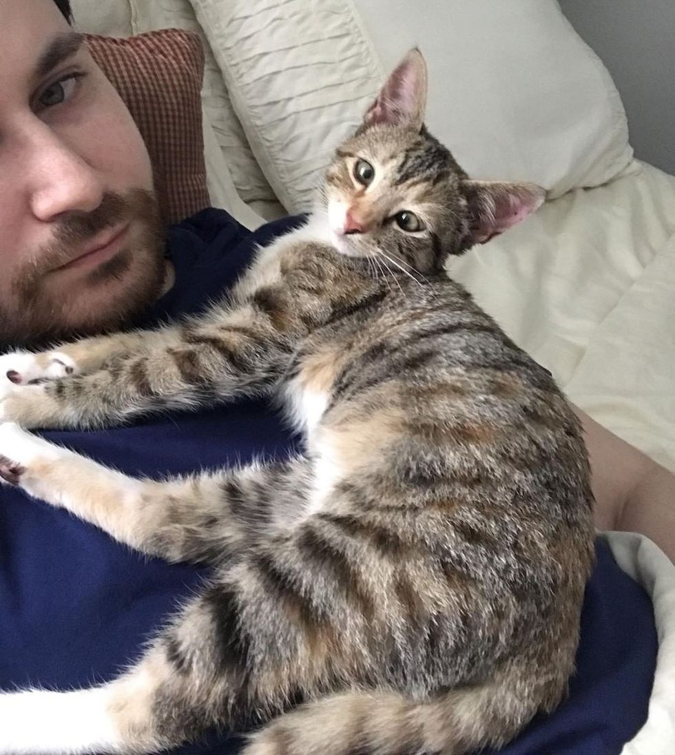 The tabby girl adores her human dad and is his most loyal companion. She's the first thing that he wakes up to in the morning, and when he comes home from work, Poodle is by the door waiting for him.