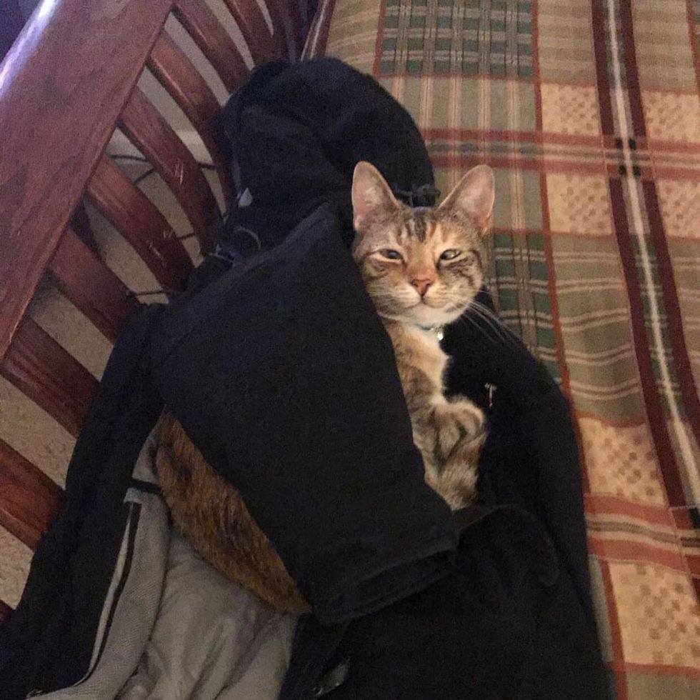 "Whenever I am getting ready for work she knows my jacket is the last thing I put on. So as soon as I leave the room, she will burrow into it," Garrett told Love Meow.