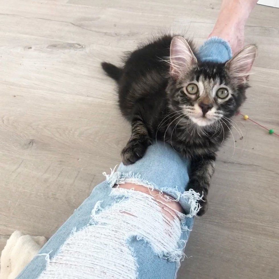 As soon as she could walk, she made her way up Patricia's lap. Fanta placed her front paws on her leg and crawled up like a champ.
