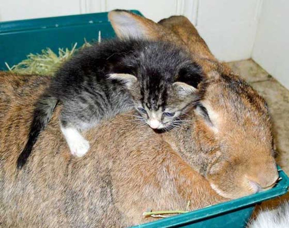 A 2 week old kitten is having a big cuddle with a giant Flemish bunny, Humphrey.