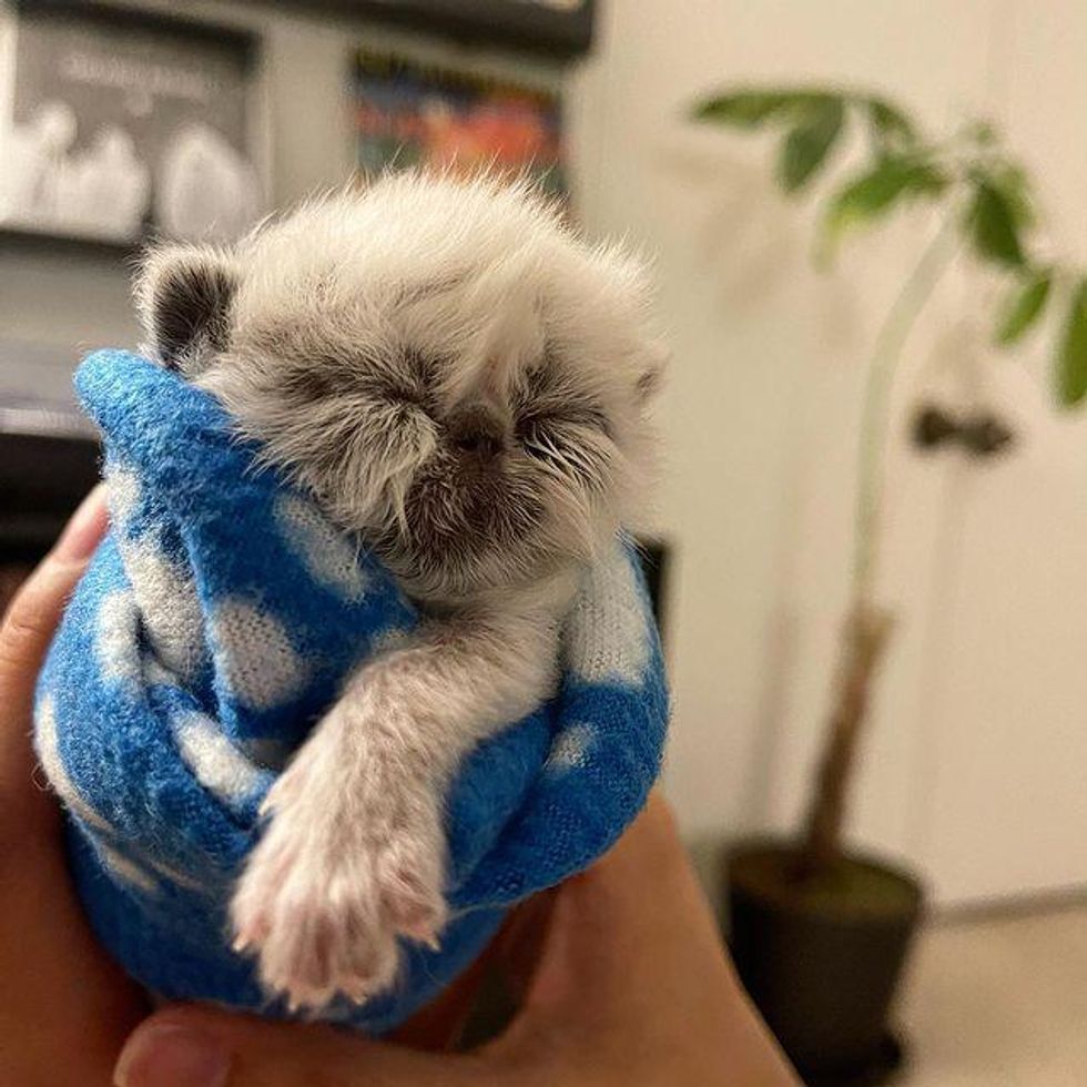 After every feeding, the pint-sized wonder enjoys some palm cuddling with his human before he rejoins his faux mama for some intense snuggles. With proper care, good food, and dedication from his foster family, the little guy is starting to thrive.