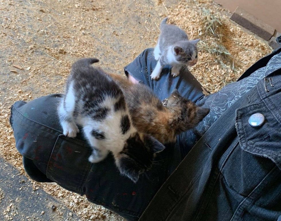 A tiny kitten ran up to a kind person on a farm. She brought her two feline siblings along.