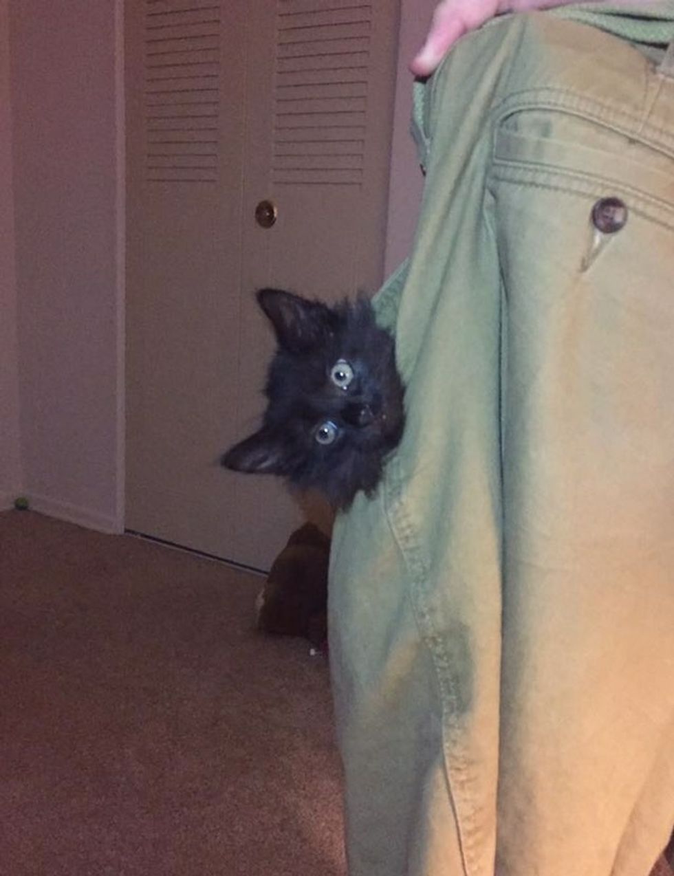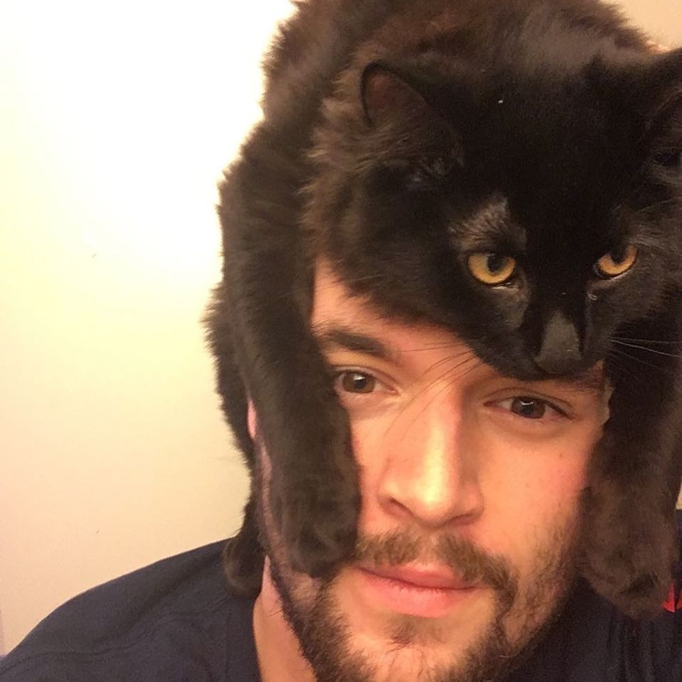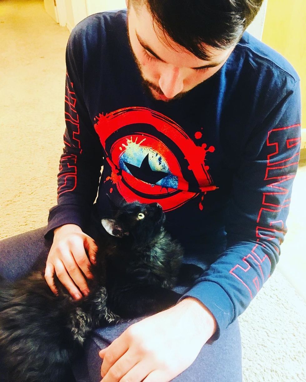 Jesse often finds his fluffy companion wrapped around him like a scarf or a hat, rumbling with his little purrs into his ears.