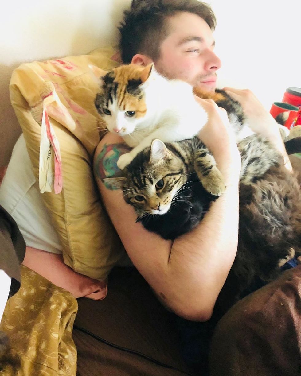 When all of his feline friends demand cuddles at the same time, Jesse gladly obliges by lovingly squeezing them in his arms.