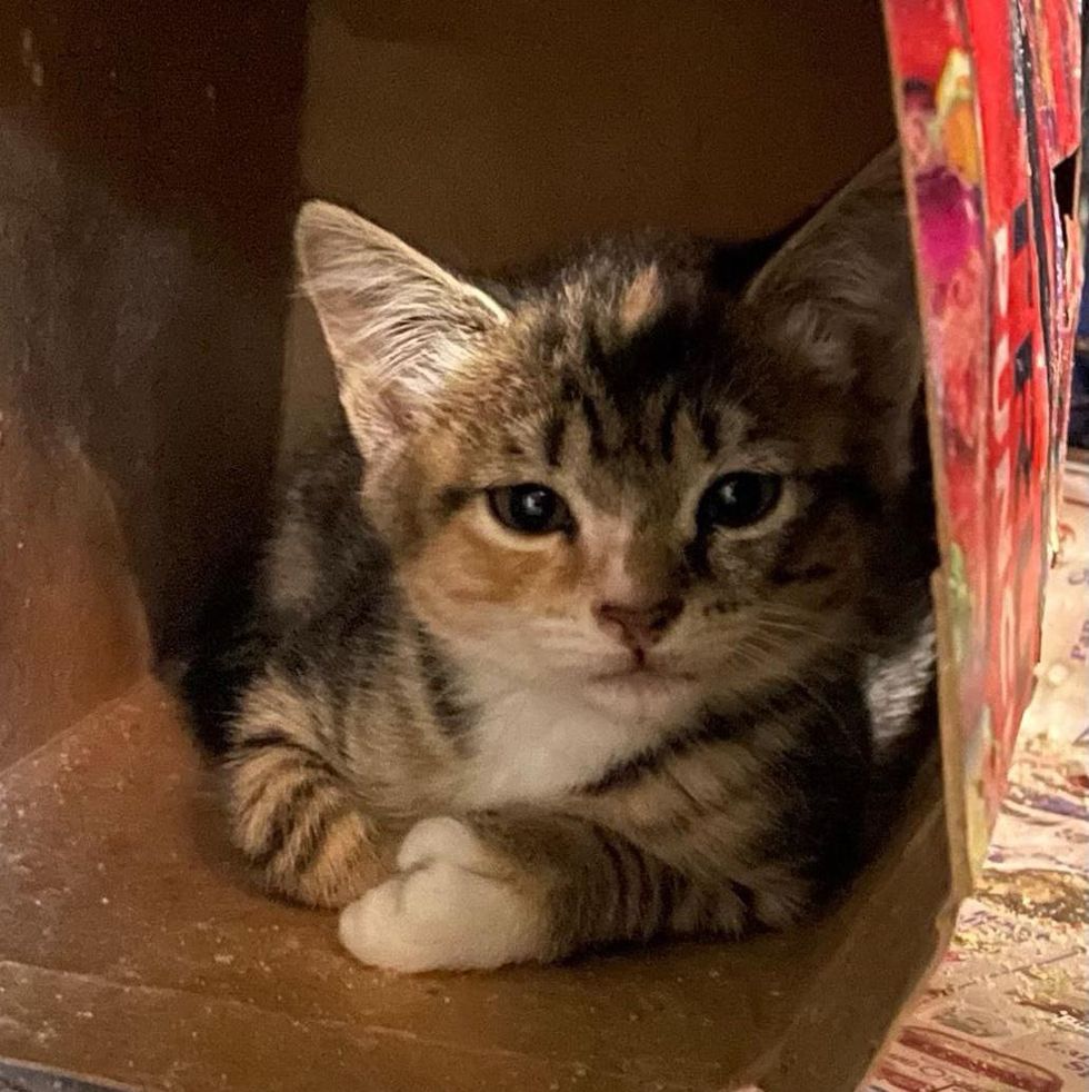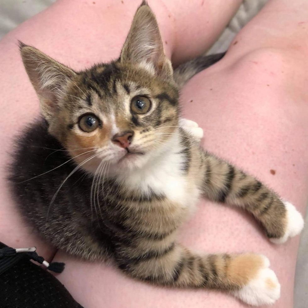 The rescuer managed to get the torbie (a cross between a tabby and a tortie) out of the hole and into a carrier. Hoping to get the kitten the best chance at a loving home, she got in touch with the Odd Cat Sanctuary.