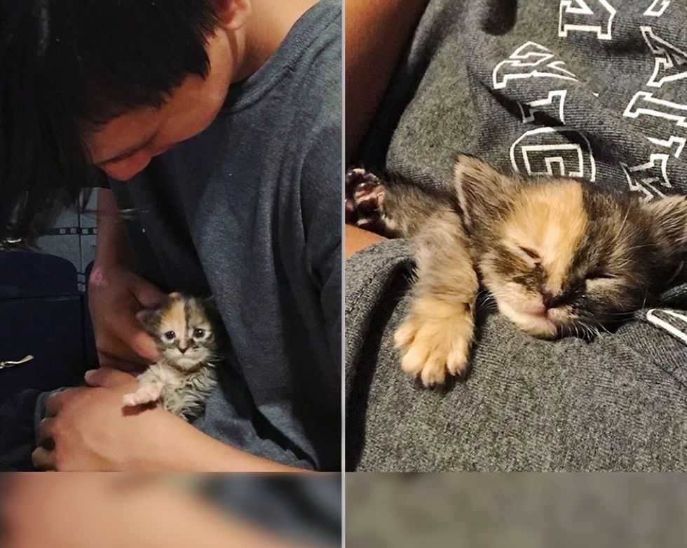 A kitten who was found in a field, snuggled up to a young man and wouldn't let go.