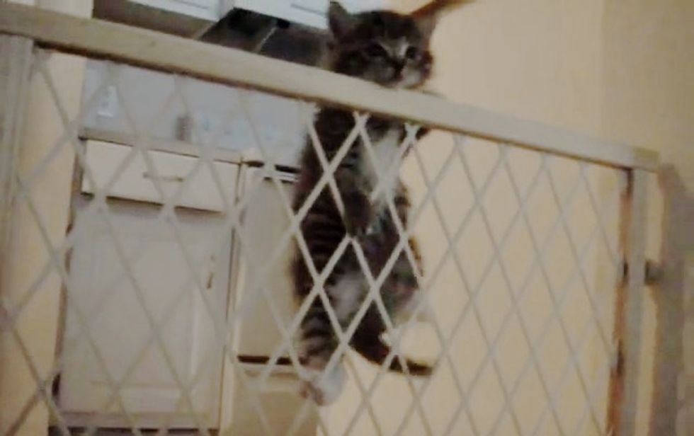 Less than two minutes after they set up the new gate they bought to keep their kitten in the 'kitty area', Dexter the kitten figured out how to climb over it.