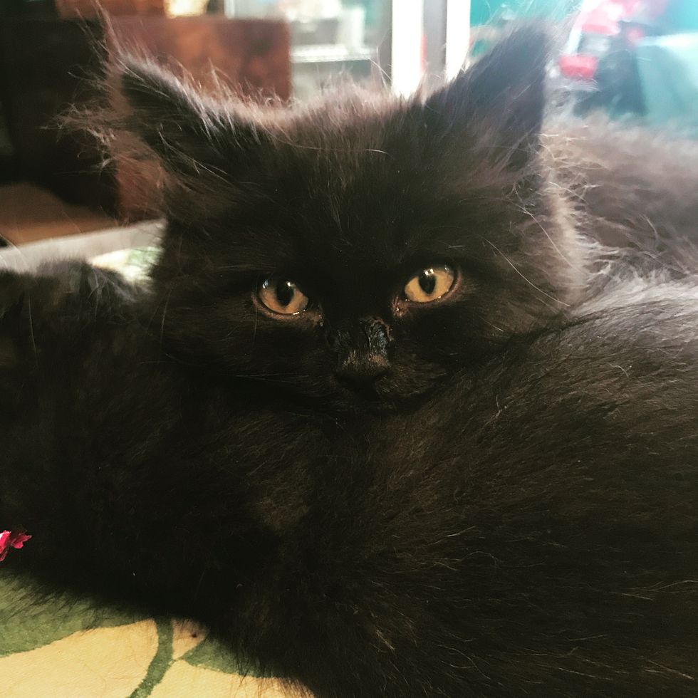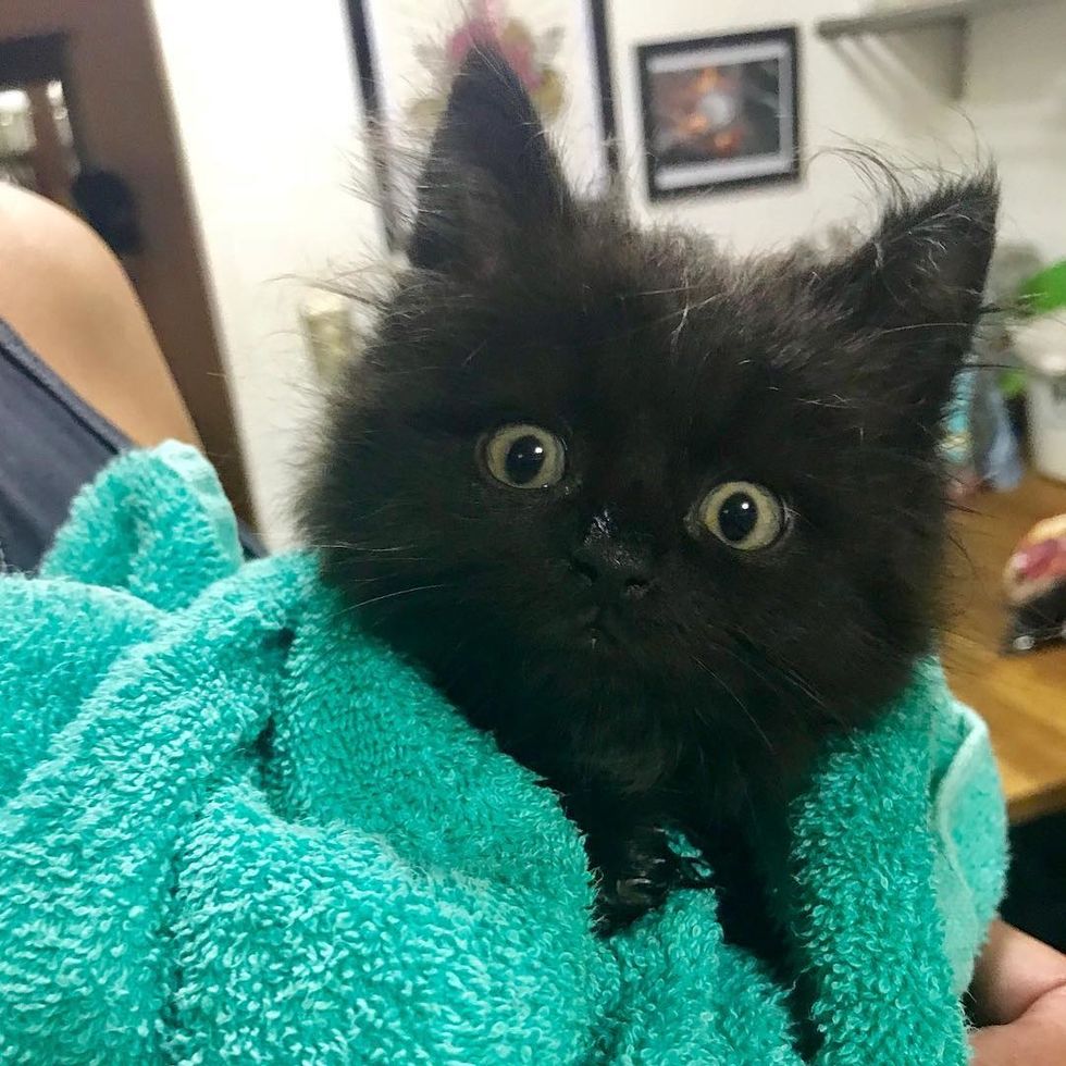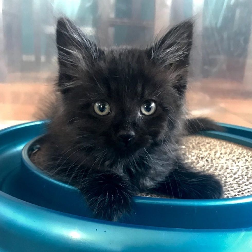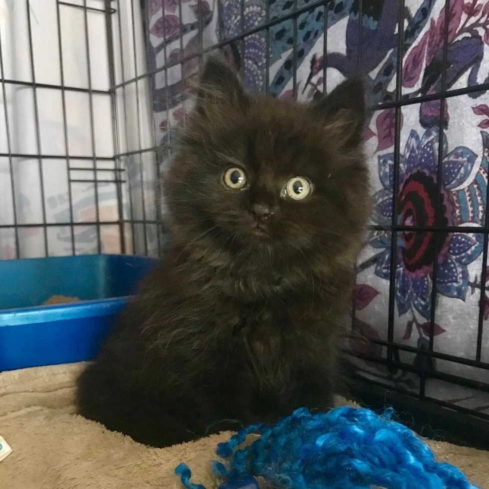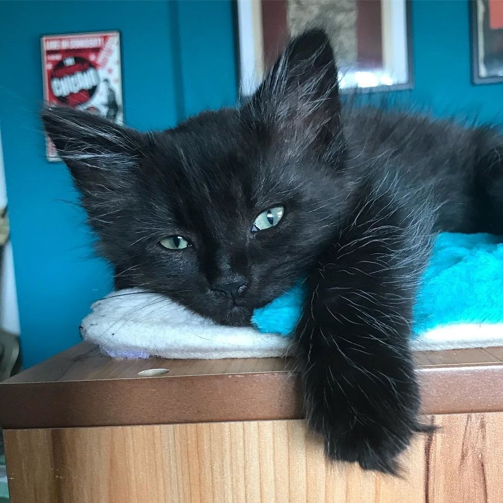 "Professor Lupin (the kitten) arrived a scared boy huddling in a corner, but after two days of purritos, treats and affection, he was out and about a bit more."