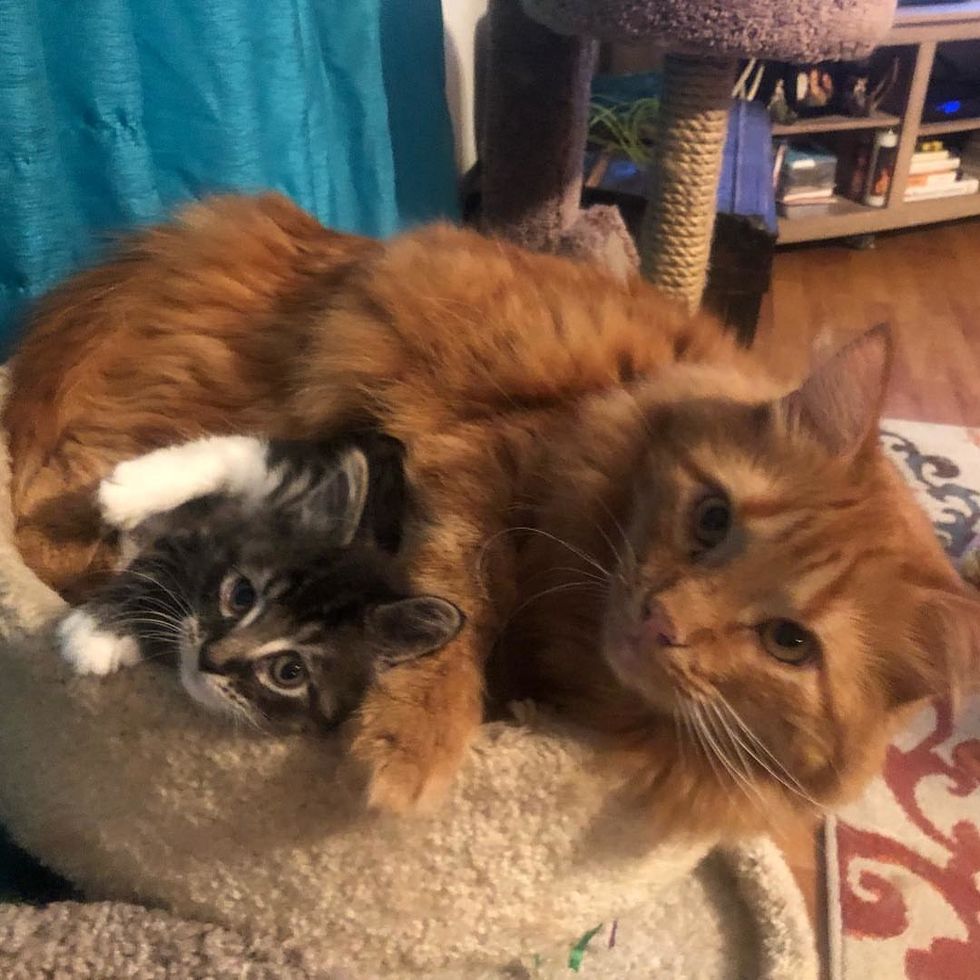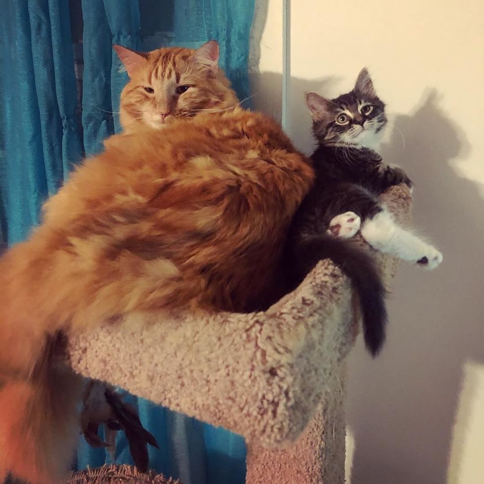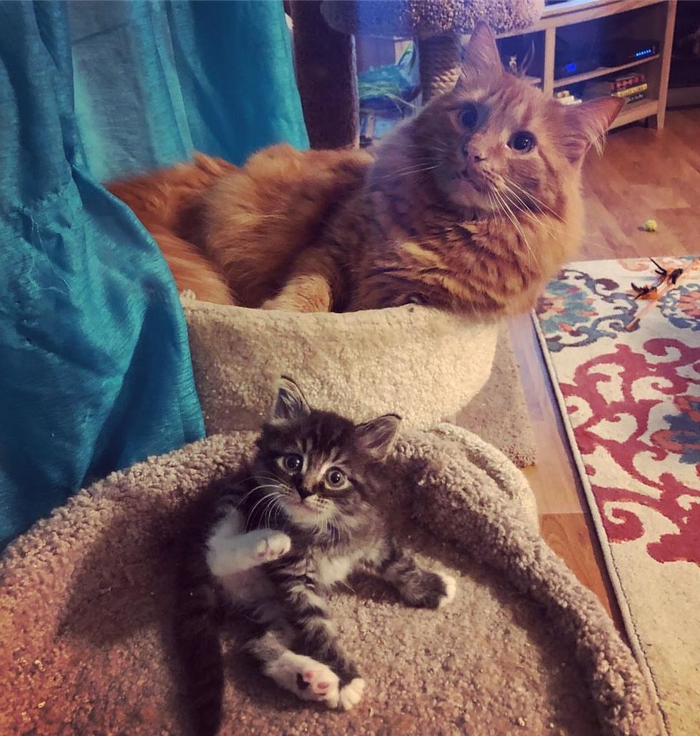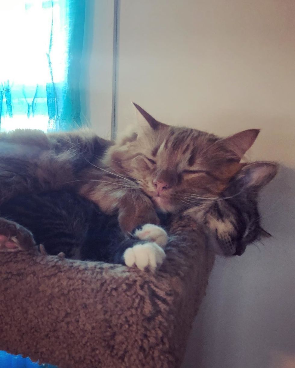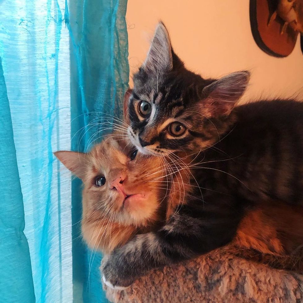 Evin is a very laid-back cat, and Sprout is extremely affectionate and needy at times. Whenever she demands attention, Evin is happy to offer a cuddle.
