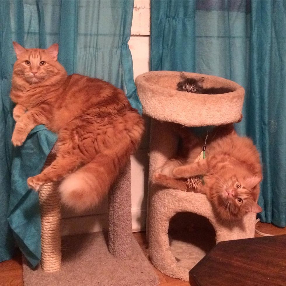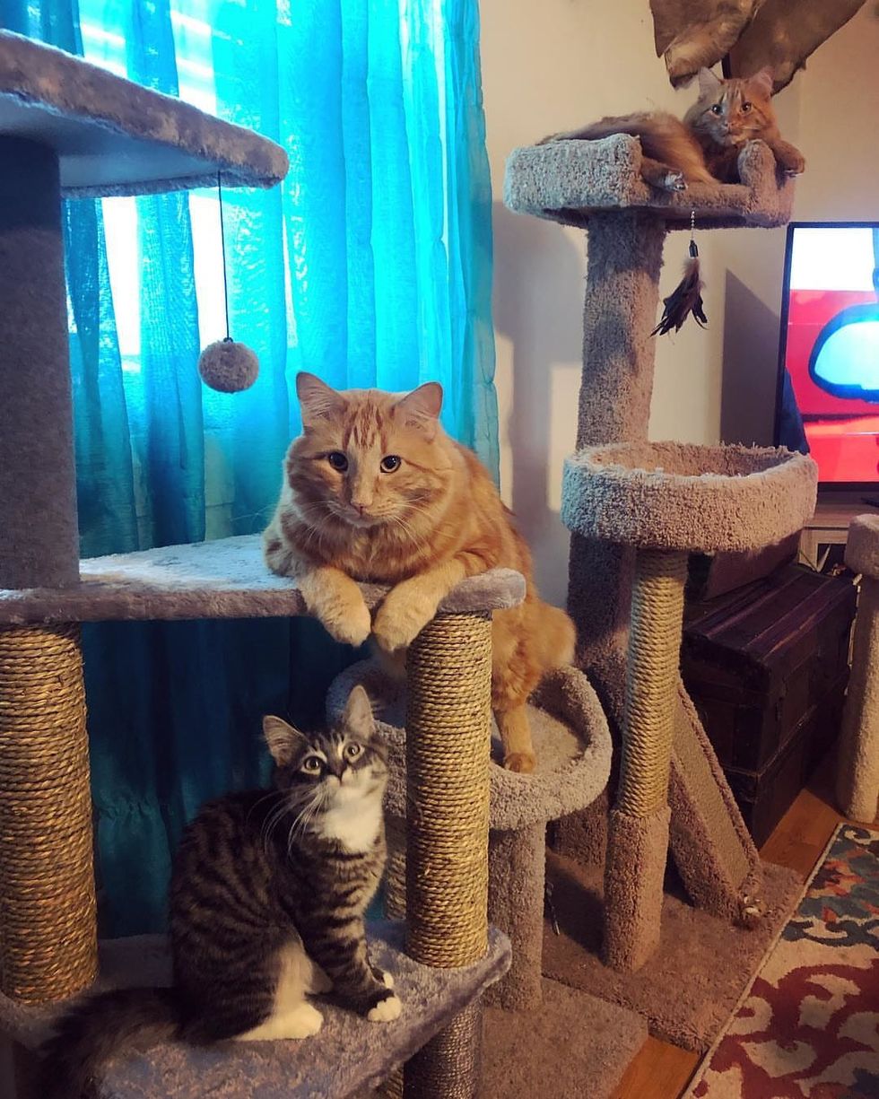 Despite having many cat beds around the house, Sprout chooses to snug in the cat tree with her buddies always.