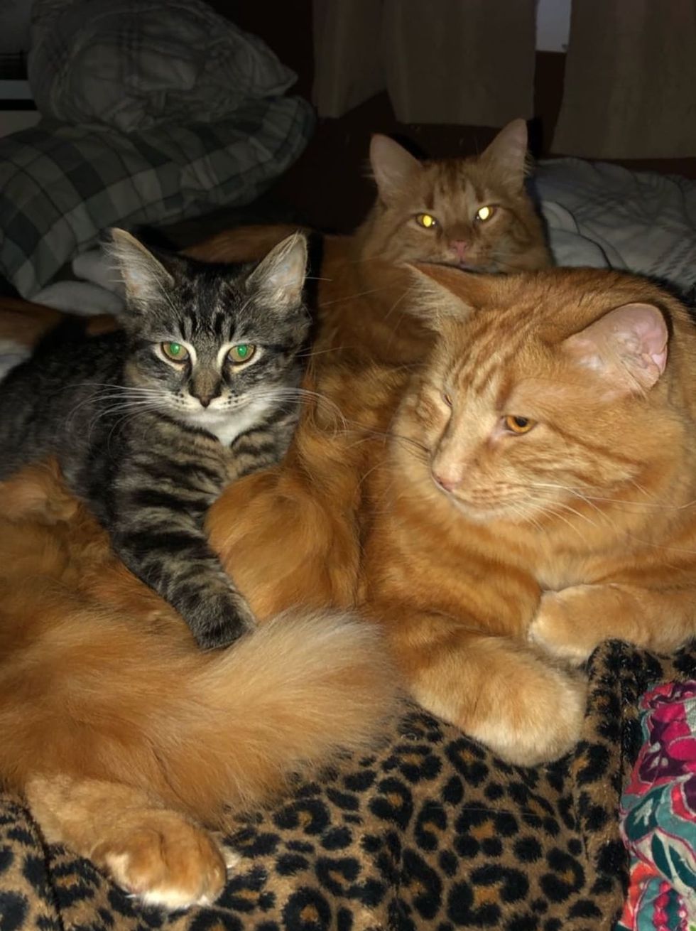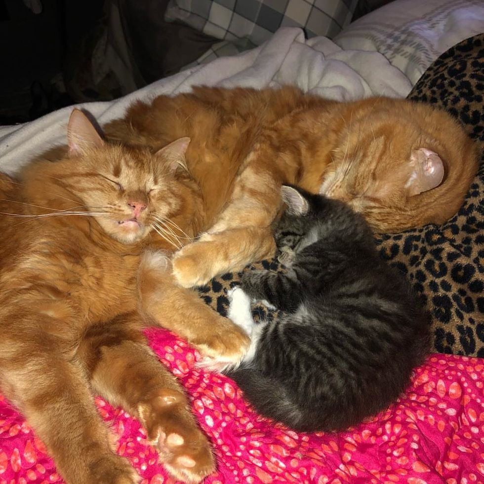 A kitten came to her new home and bonded with two ginger cats who took her in as their own.