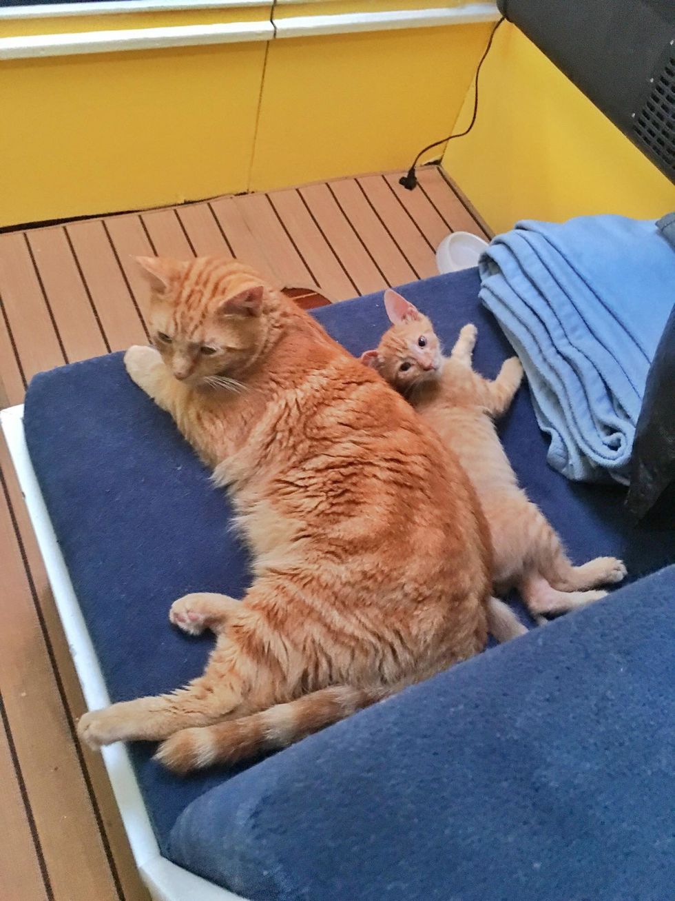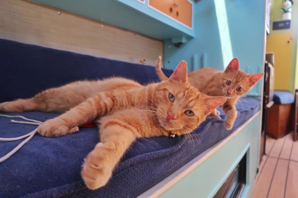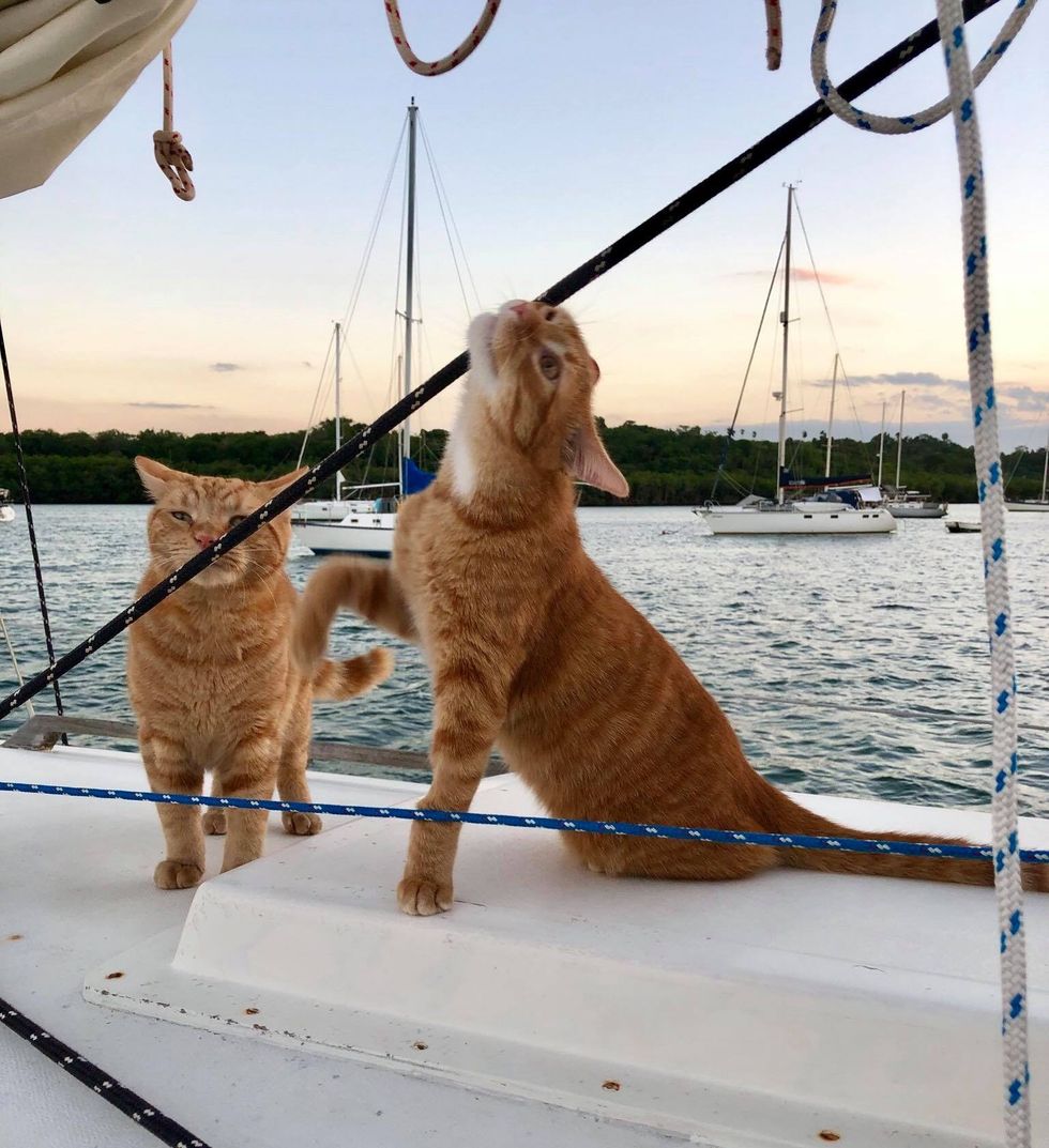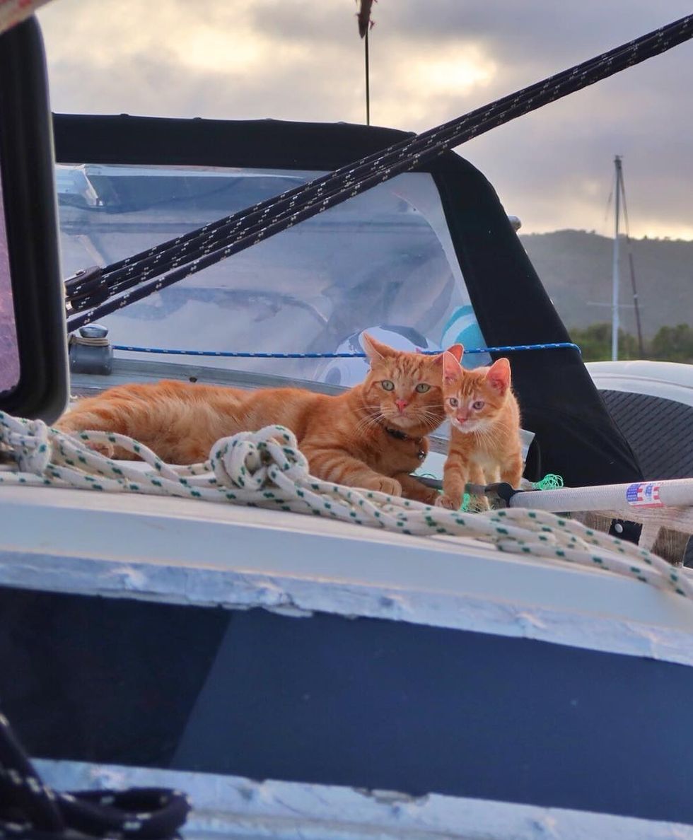 "He was teaching our new baby how to be a good boat cat! Zissou is really enjoying living on a sailboat!"