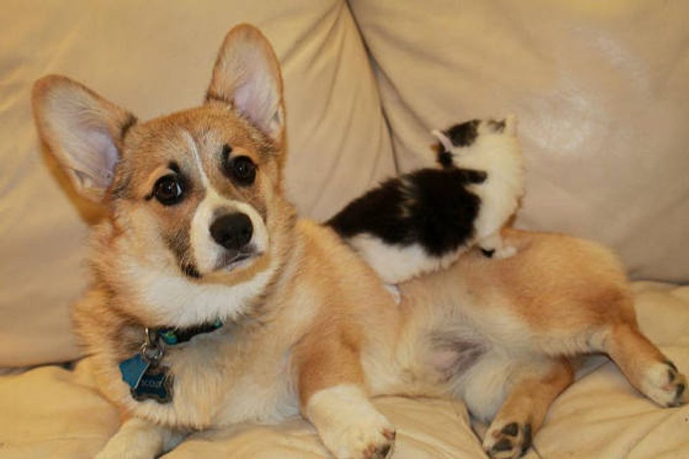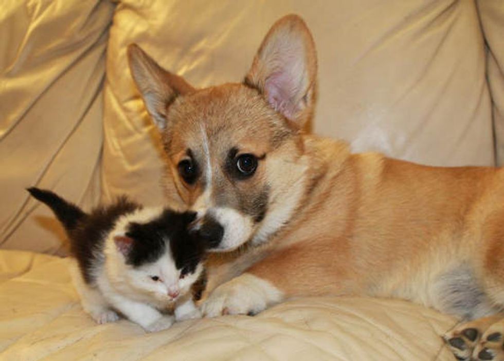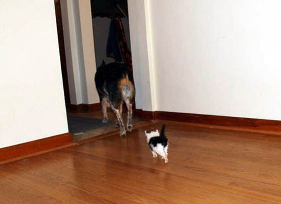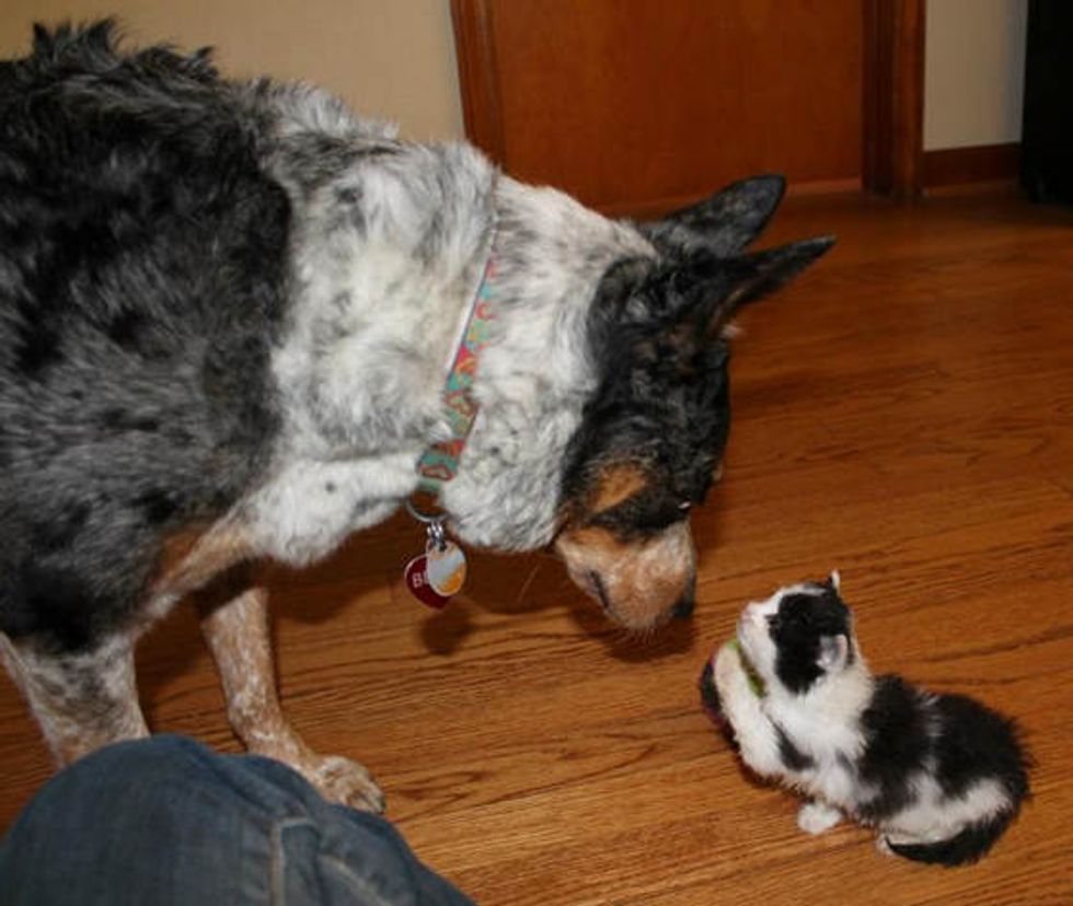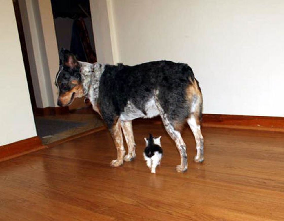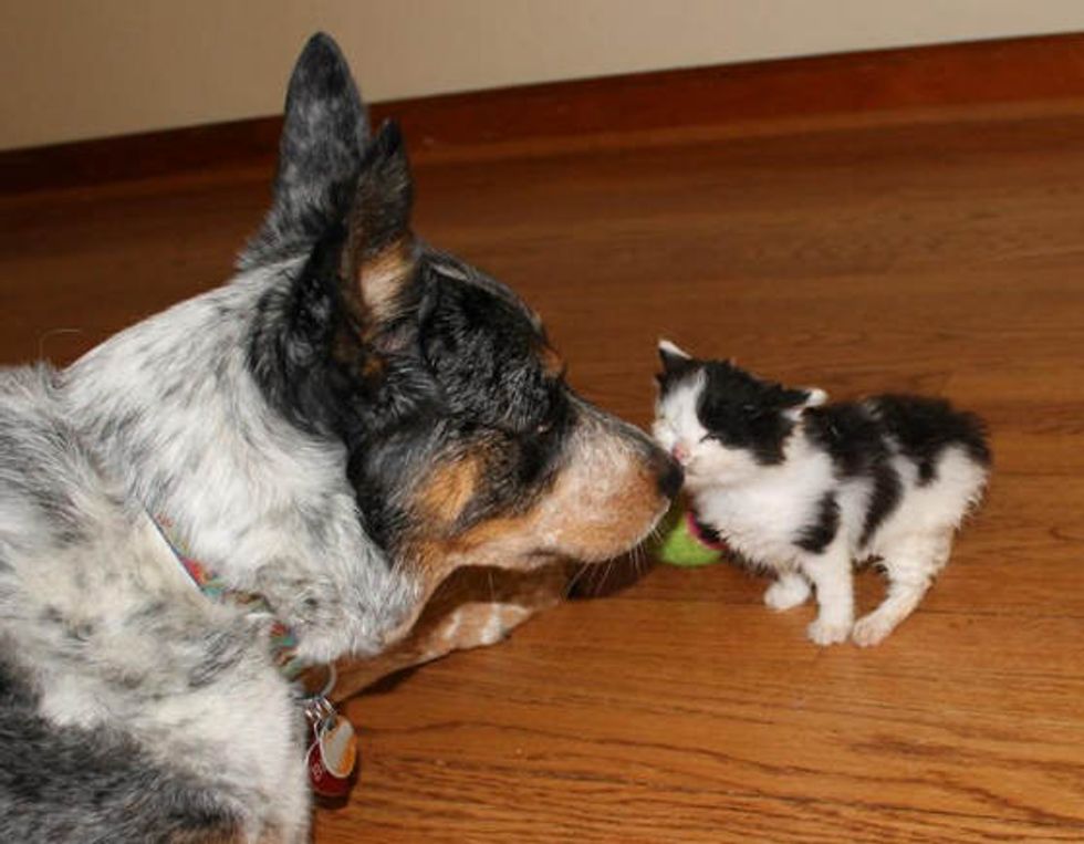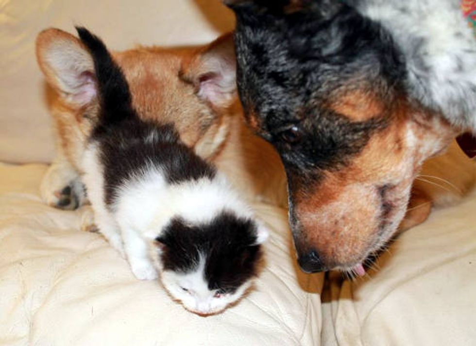 A tiny kitten was adopted by two gentle canine friends, and they became the kitty's surrogate parents.