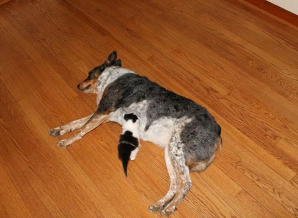 Belle lays down and kitty starts nursing even though she doesn't produce any milk.