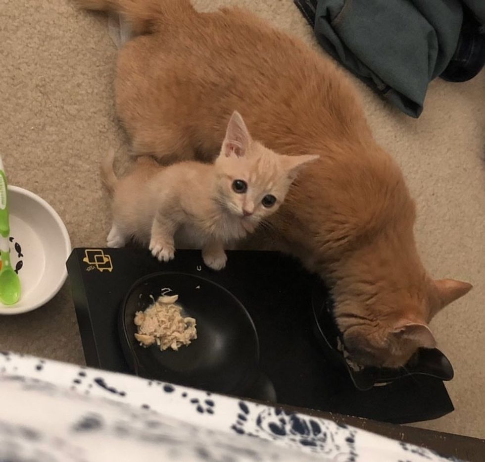 She took Pukini under her wing and started mothering her. The kitten would follow her around the house and even try to imitate her by eating from a big bowl.