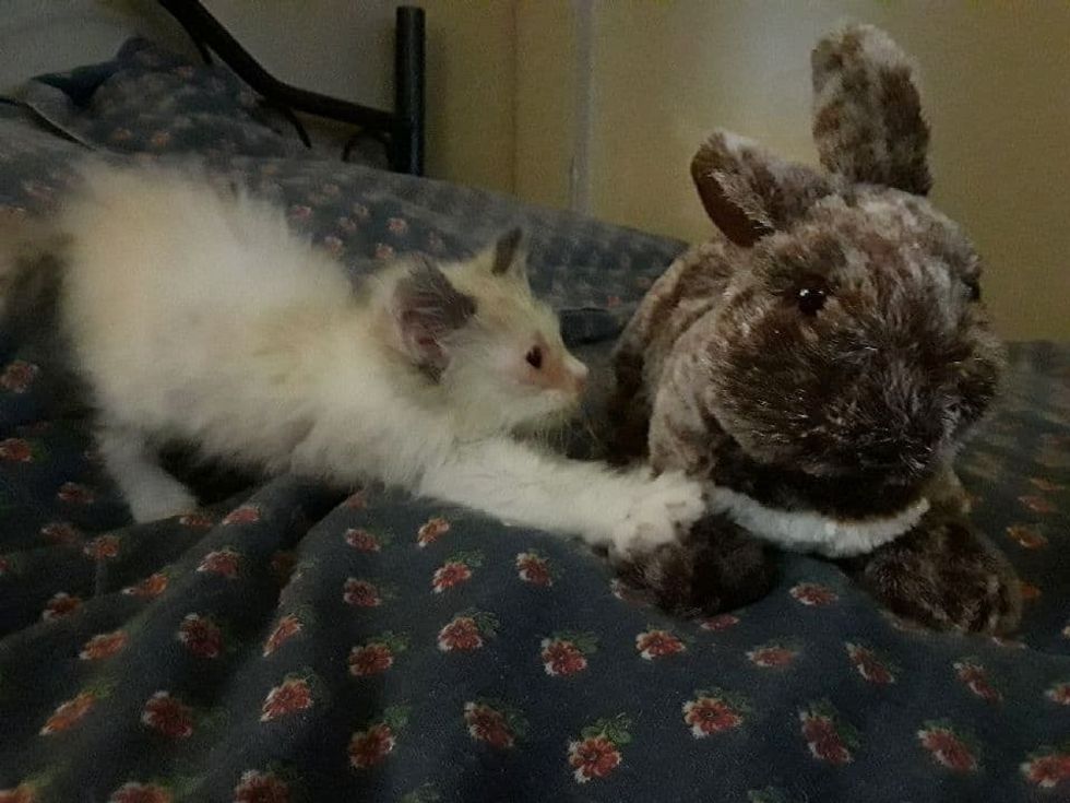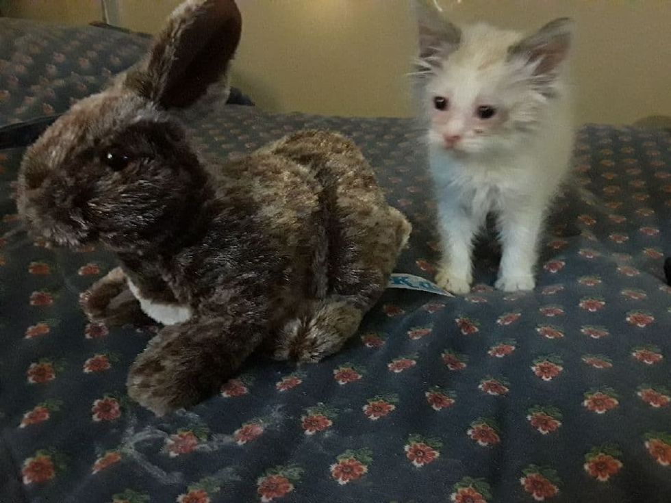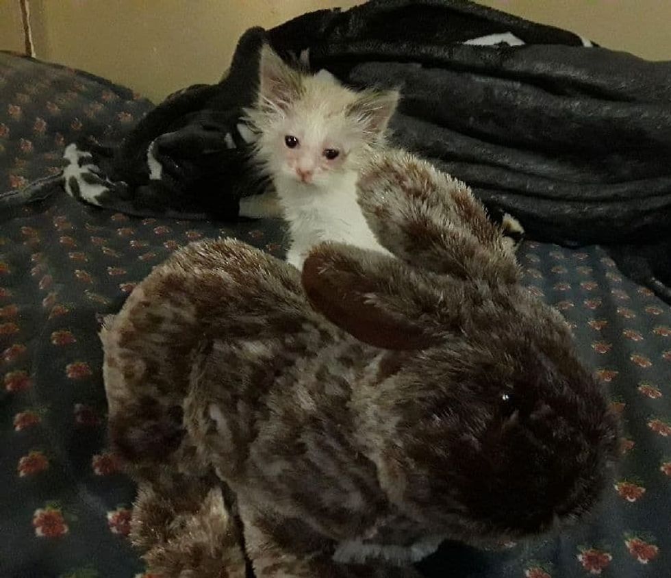 Santana, who owns a bunny named Stu, had never cared for a kitten before but he offered to foster the little one so she could have someone to nurse her back to health.