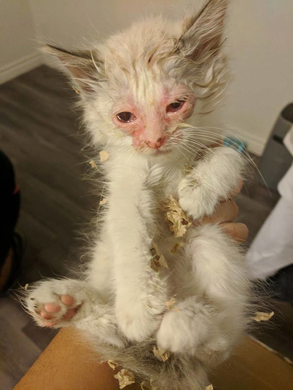 "The kitten was alone, covered in fleas, and had a really severe upper respiratory infection. Her eyes were sealed shut, and she was weak, malnourished and very hungry," Jacqueline DeAmor, co-founder of Friends for Life Rescue Network, told Love Meow.