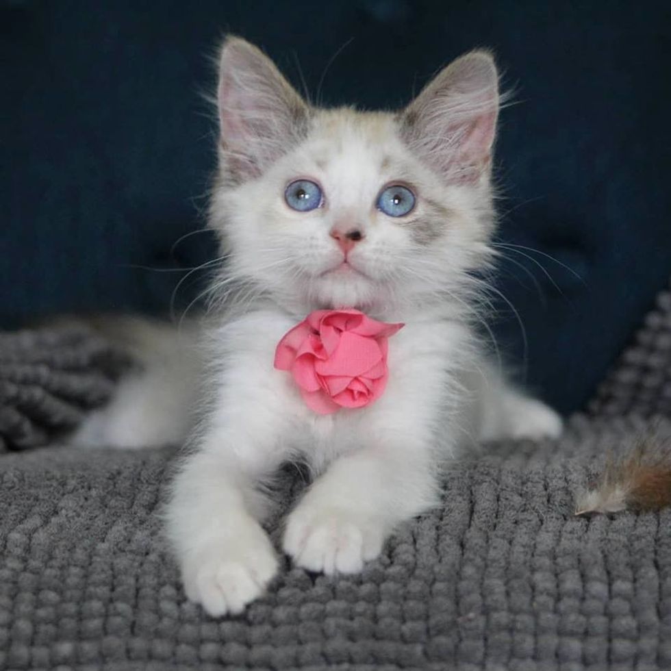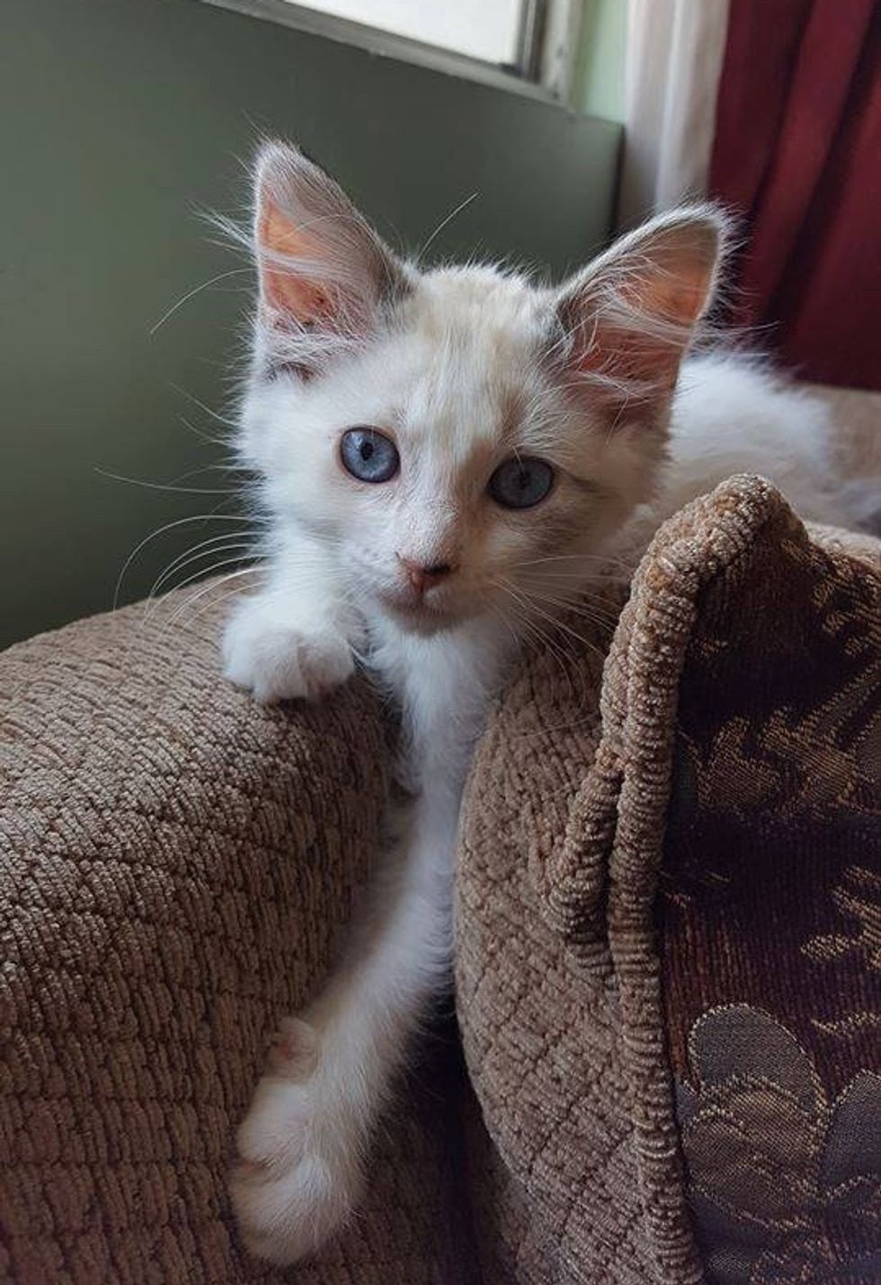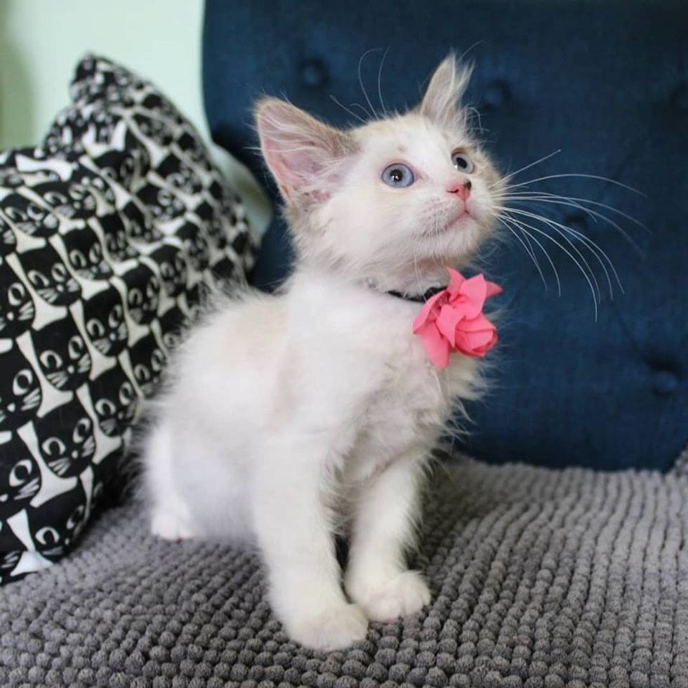 The kitten who couldn't even open her eyes when she was found, now shows off her beautiful blue eyes and a larger-than-life personality.